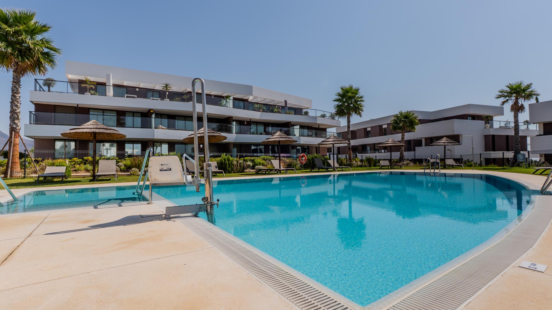 Lejlighed i stueetagen til salg i Camarate Golf, Bahia de Casares med 3 Soveværelser, 2 Badevær., 2 en-suite badeværelser, bilt i 2023 og har pool (), garage () og have (). Dimensioner: 154m² bolig, 113m² areal og 82m² terrase.