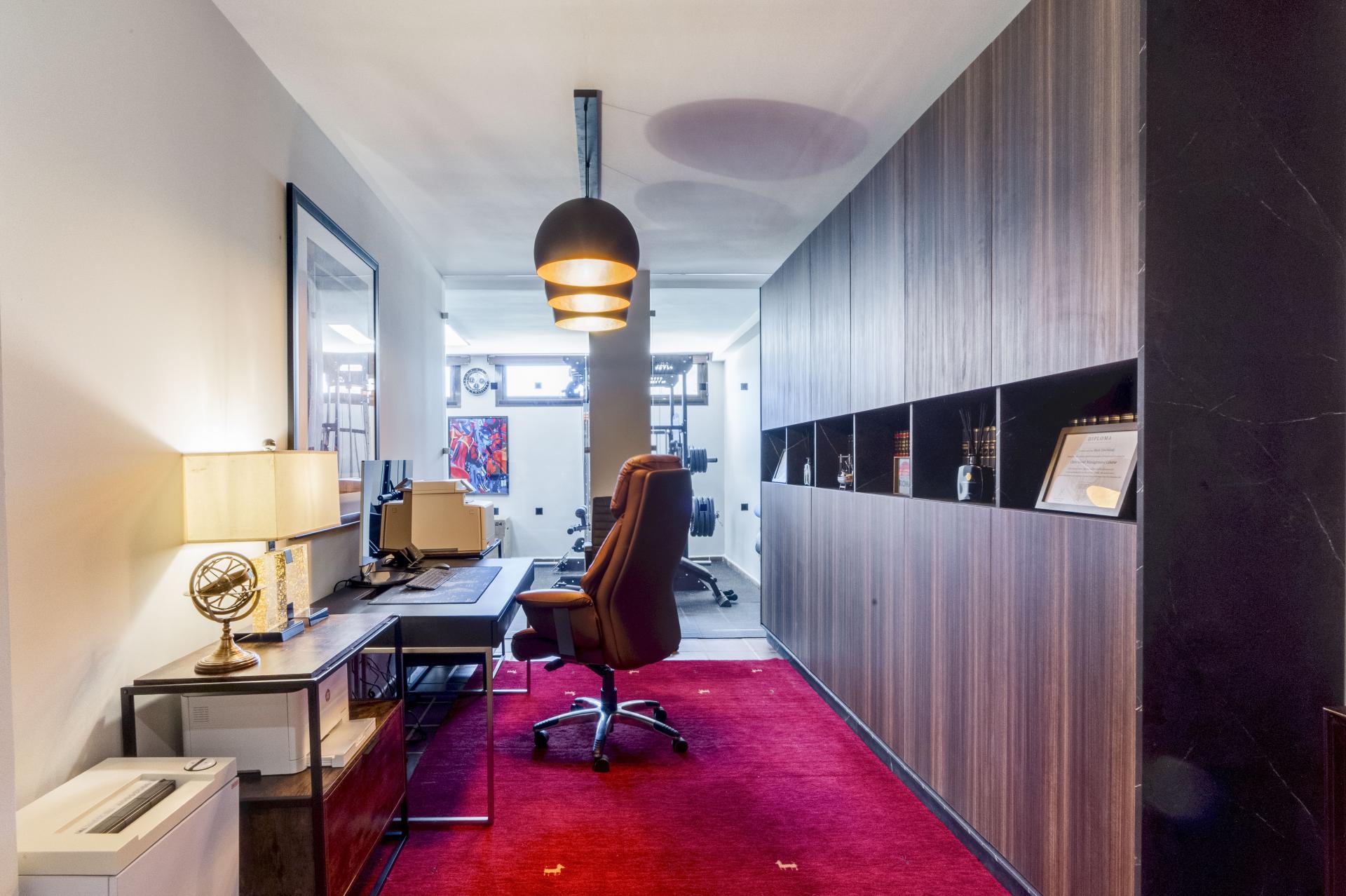 Spanning ett totalt byggt område på 175m2, med en inredning på 145m2 och en 26m2 privat terrass, erbjuder denna villa en imponerande layout över flera nivåer. Den nedre våningen innehåller ett bekvämt lounge område, ett dedikerat gym, ett praktiskt kontorsrum, en tvättsvit och ett generöst förvaringsrum. Levande och underhållande utrymmen flödar utan ansträngning tack vare en öppen plan levande dining arrangemang, accentuerad av ett modernt, fullt utrustat kök. Villan drar nytta av både luftkonditionering och en eldstad, vilket garanterar komfort under hela året. Naturligt ljus badar interiören på grund av sydväst orientering, medan flera terrasser och ett solarium ger omfattande områden för avkoppling och al fresco mat. Den privata terrassen är en särskild höjdpunkt med lugn utsikt över sjön, frodiga trädgårdar och fängslande panoramautsikter.