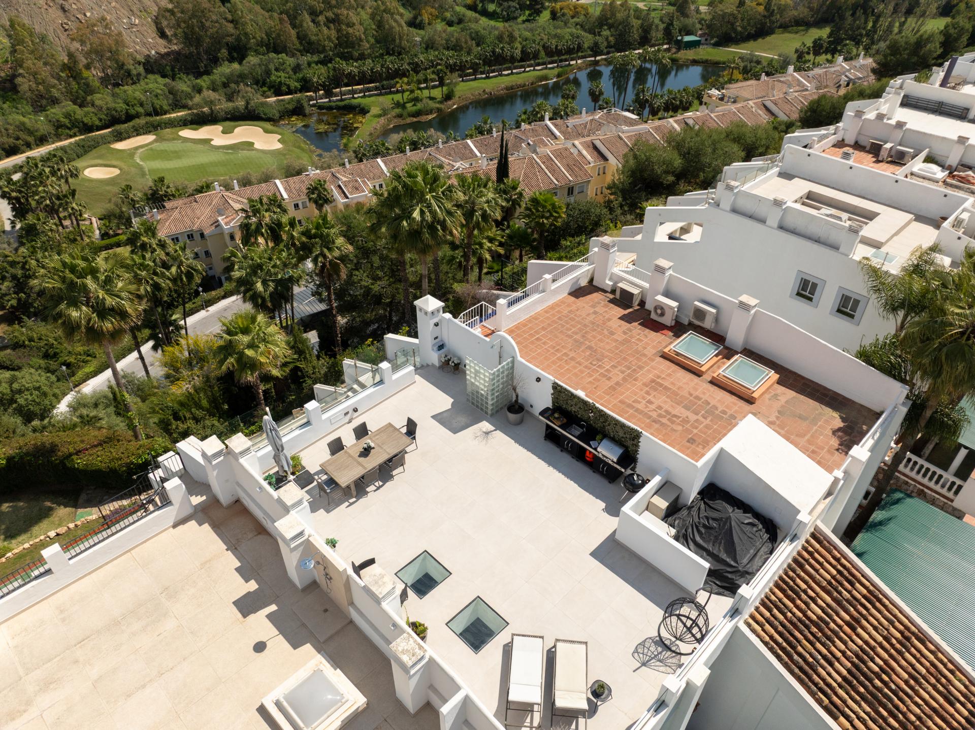 Takvåning till salu i La Quinta, Benahavis med 2 sovrum, 2 badrum, 1 en-suite bathroom, inbyggd 1990 och har Pool (gemensam), garage (carport) och trädgård (gemensam). Mått: 96m² byggd, 81m² interiör och 100m² terrass.