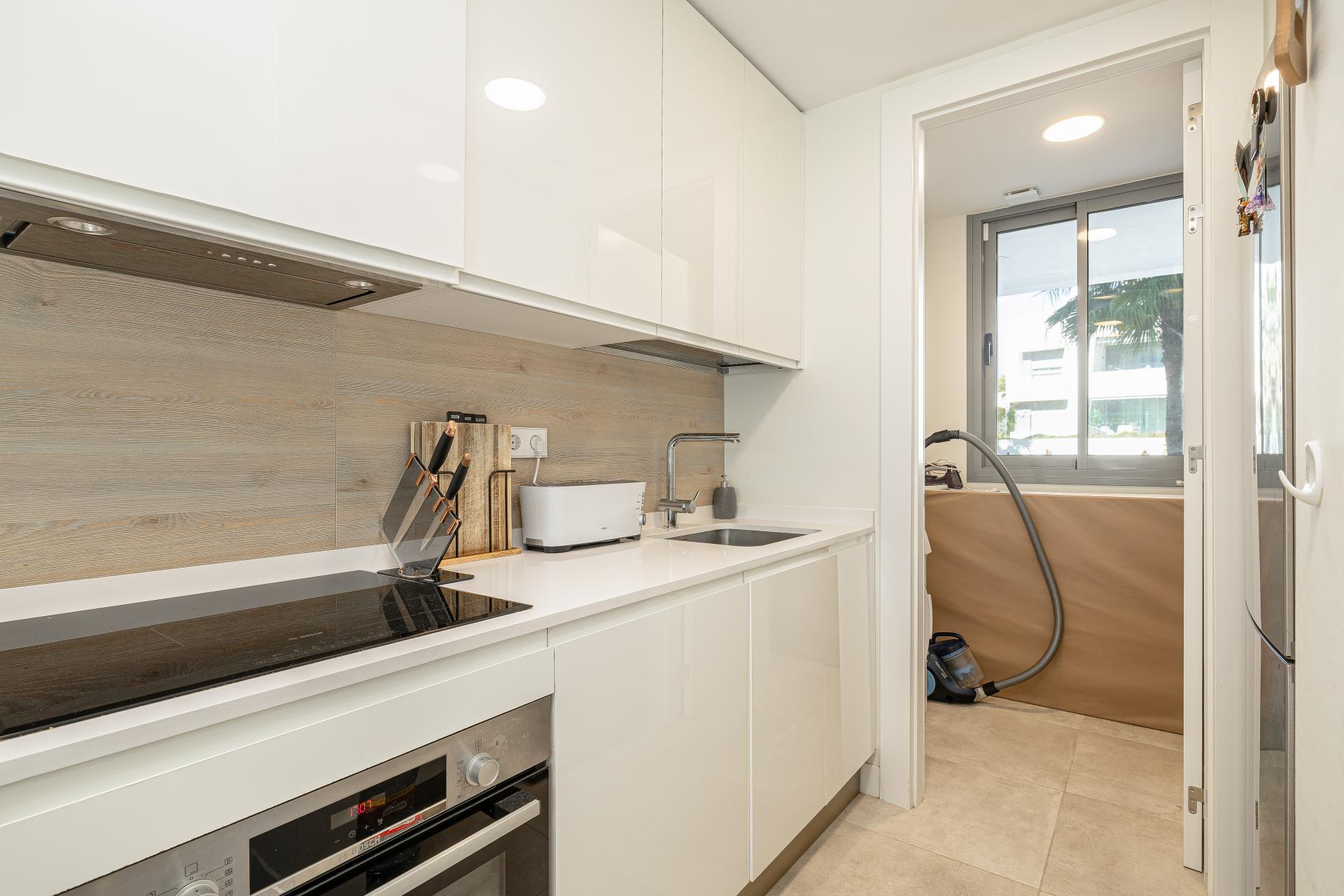 Markplanslägenhet till salu i New Golden Mile, Estepona Öst med 2 sovrum, 2 badrum, inbyggd 2020 och har Pool (gemensam), garage (gemensam) och trädgård (privat). Mått: 94m² byggd, 79m² interiör och 27m² terrass.
