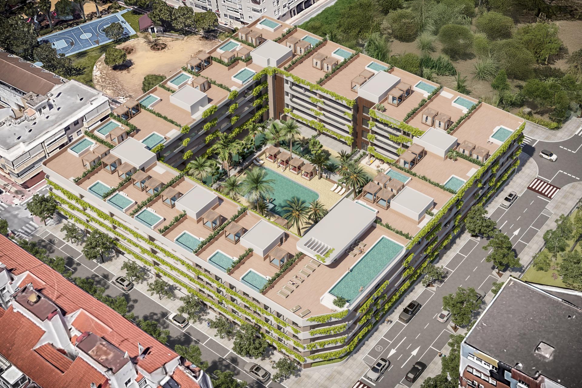 Hög nivå gemensamma områden avsedda för välbefinnande, inklusive en oändlig takpool, trädgårdsnivå pool, gym, spa med bastu, coworking, social klubb, Medelhavsträdgårdar, 24 timmars säkerhet och underjordiskt garage med förvaringsrum och laddare för elektriska fordon.