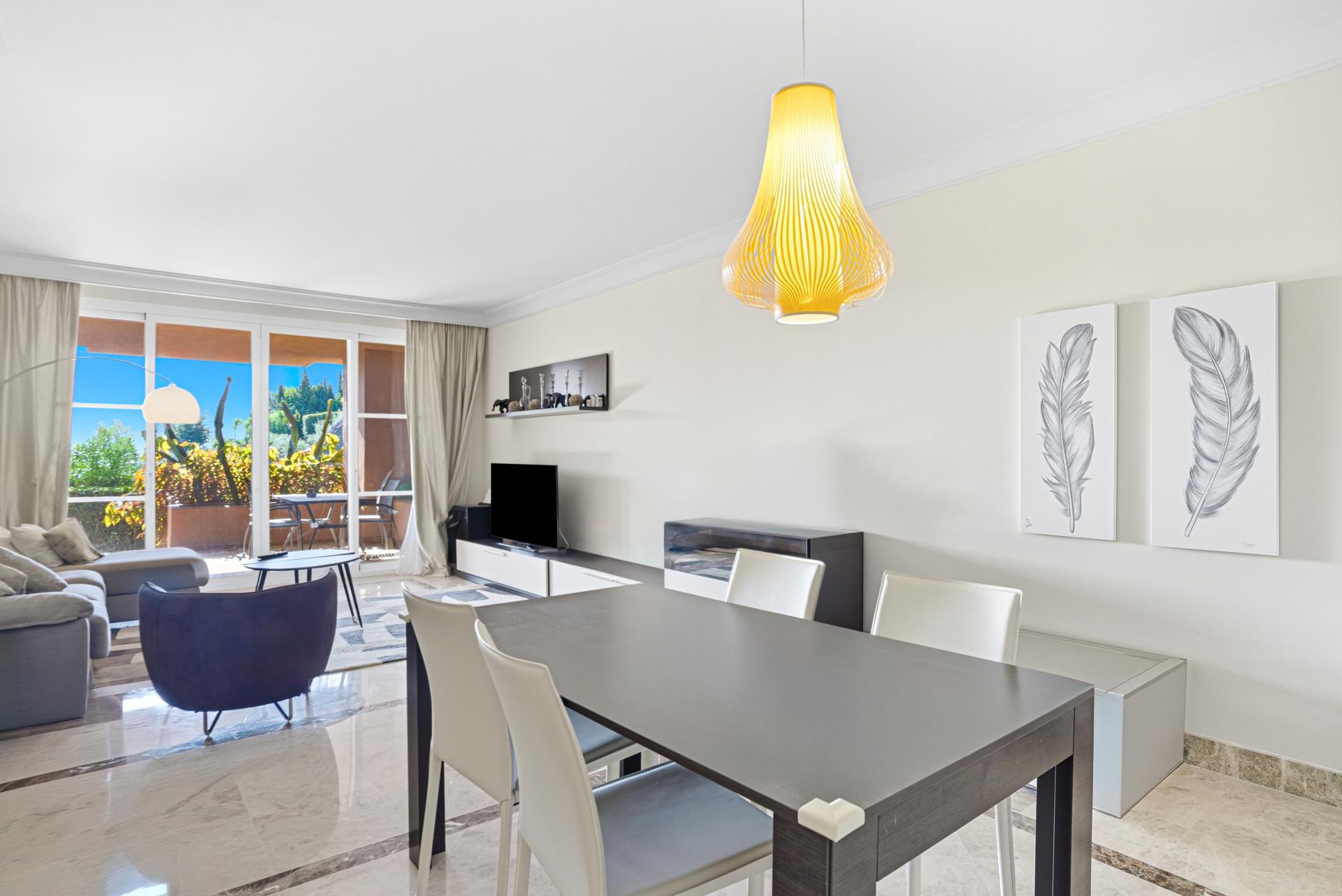 Elegant ground-floor apartment located in one of the most exclusive and peaceful developments in Nueva Andalucía. This carefully maintained property offers the perfect blend of comfort, privacy, and Mediterranean charm. It features two spacious bedrooms and two bathrooms, including a master bedroom with en-suite bathroom. Both bedrooms enjoy access to their own private terraces, providing plenty of natural light and added privacy. The independent kitchen is fully equipped and includes a convenient laundry area. The bright living-dining room opens onto a large private terrace with direct access to the communal pool, ideal for enjoying outdoor living all year round. Additional features include a private underground parking space and a storage room. Set within a gated community with 24-hour security, the complex is surrounded by lush tropical gardens, a lake, and a large swimming pool, offering a secure and peaceful environment. Ideally located just minutes from Puerto Banús, top golf courses, and all essential amenities, this property is an excellent choice as a permanent residence, holiday home, or investment opportunity.