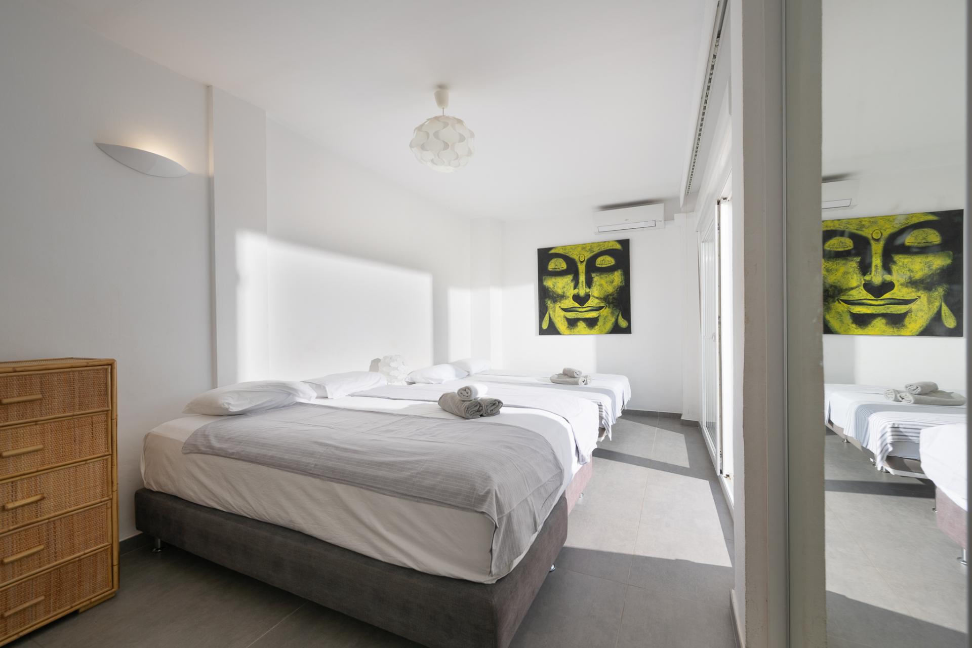 Lower level: Spacious bedroom with room for two double beds, en-suite bathroom, and direct pool access.