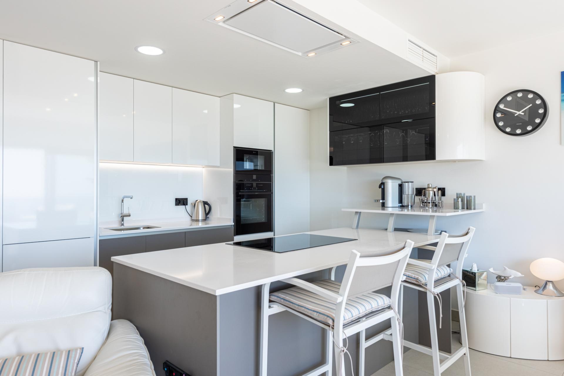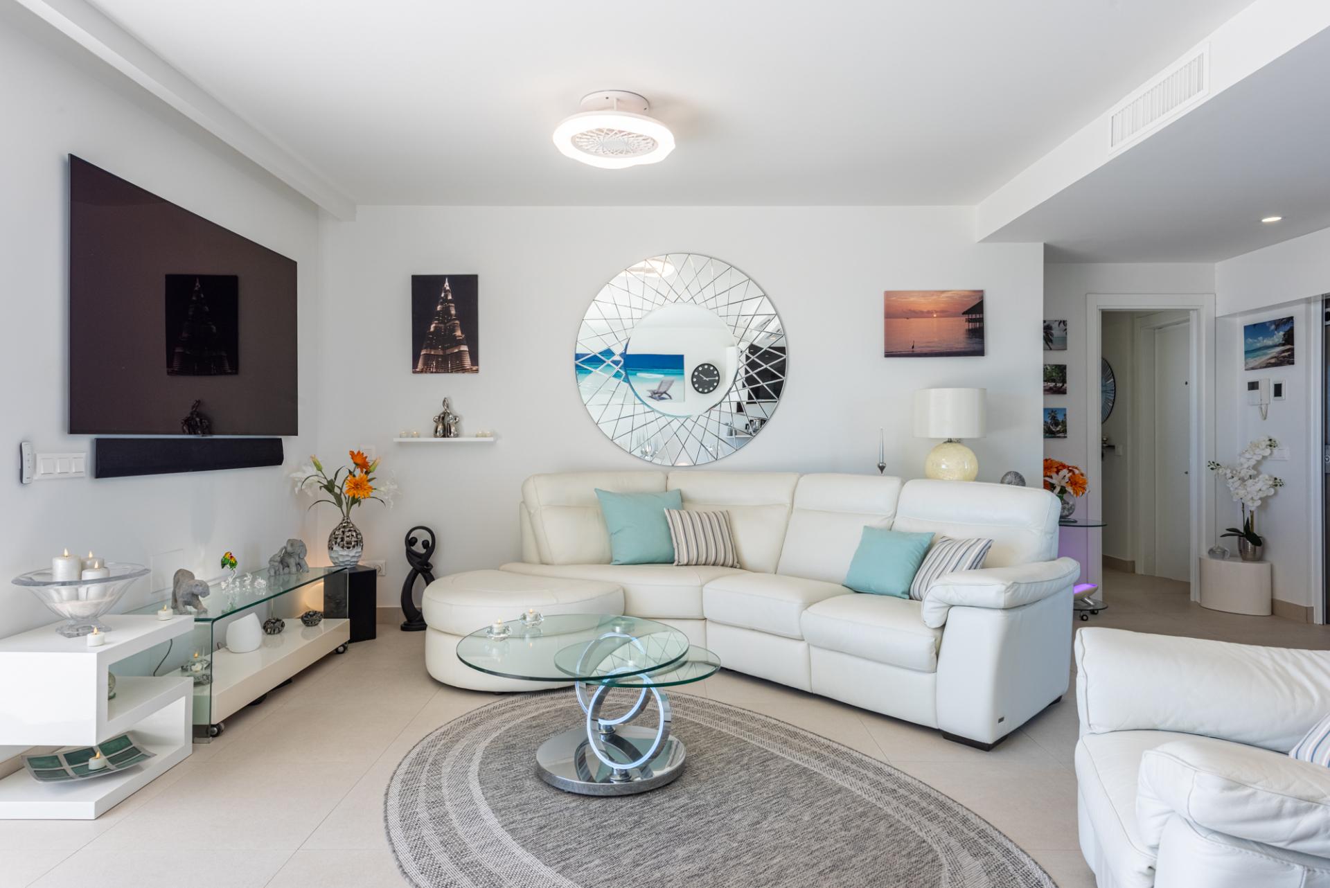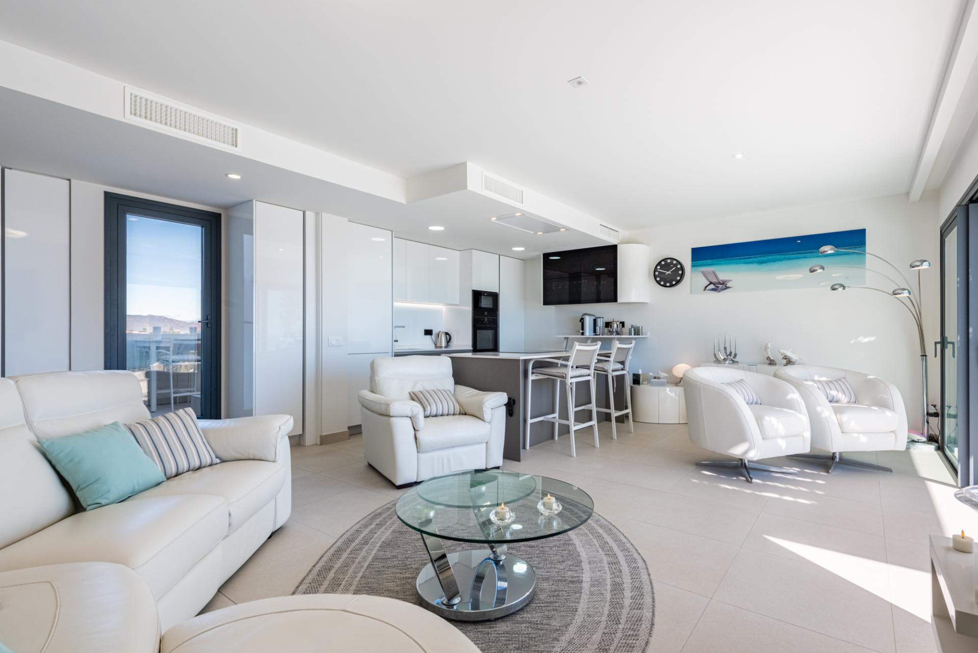 The particularly bright, double aspect living accommodation impresses with it's modern open plan spaces. When sitting on the sofa, views can be enjoyed of both the Med to the front & the countryside and mountains to the rear.