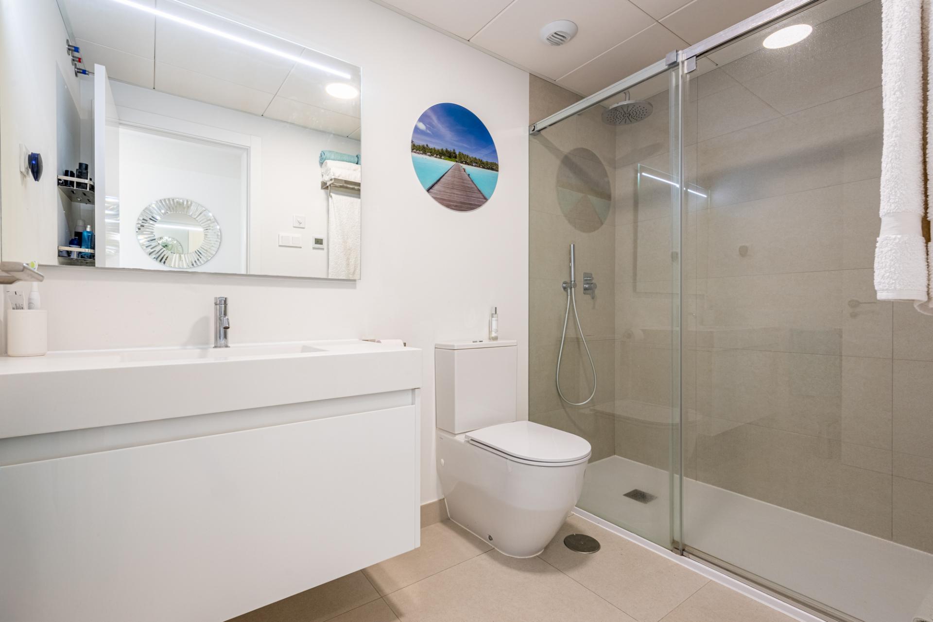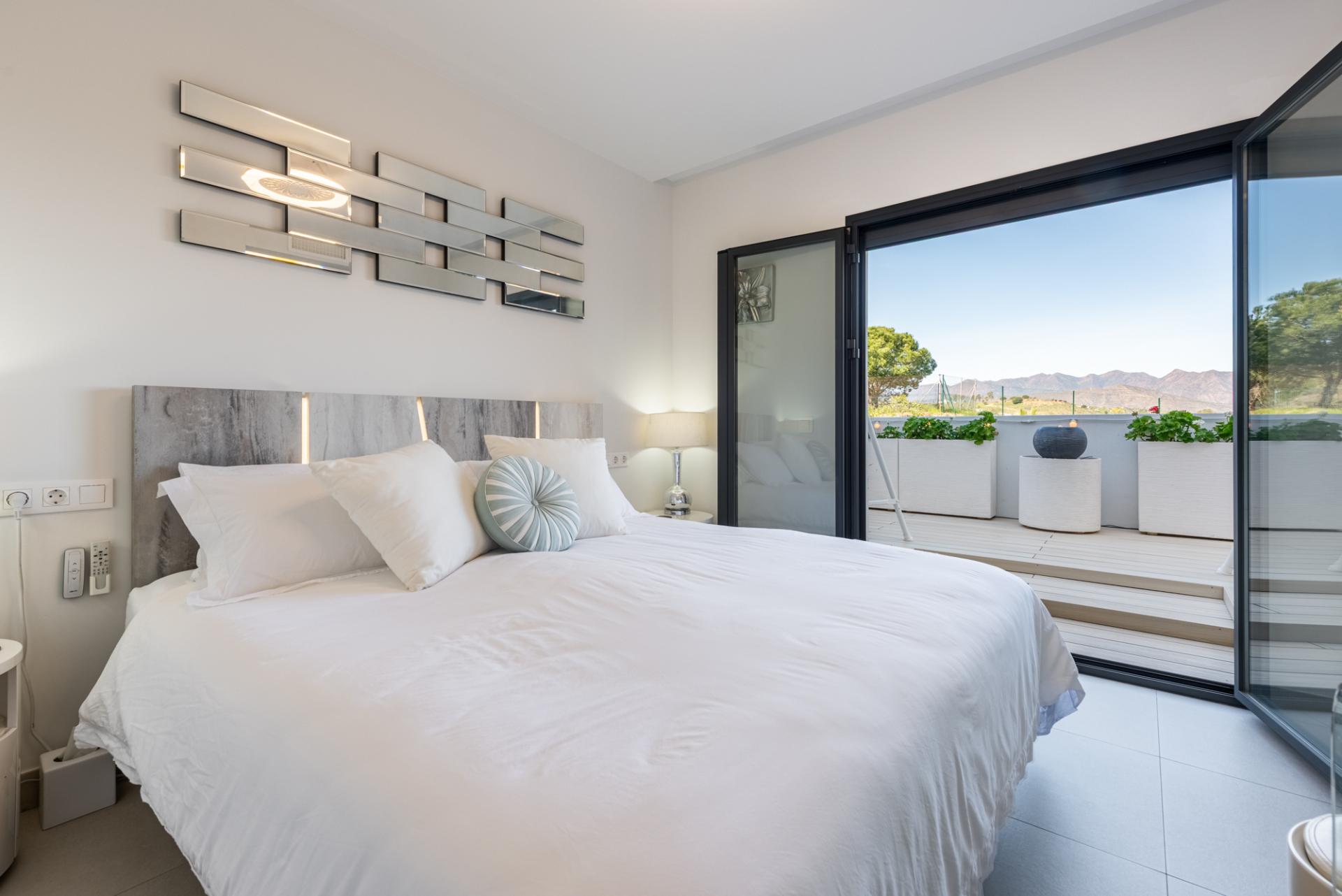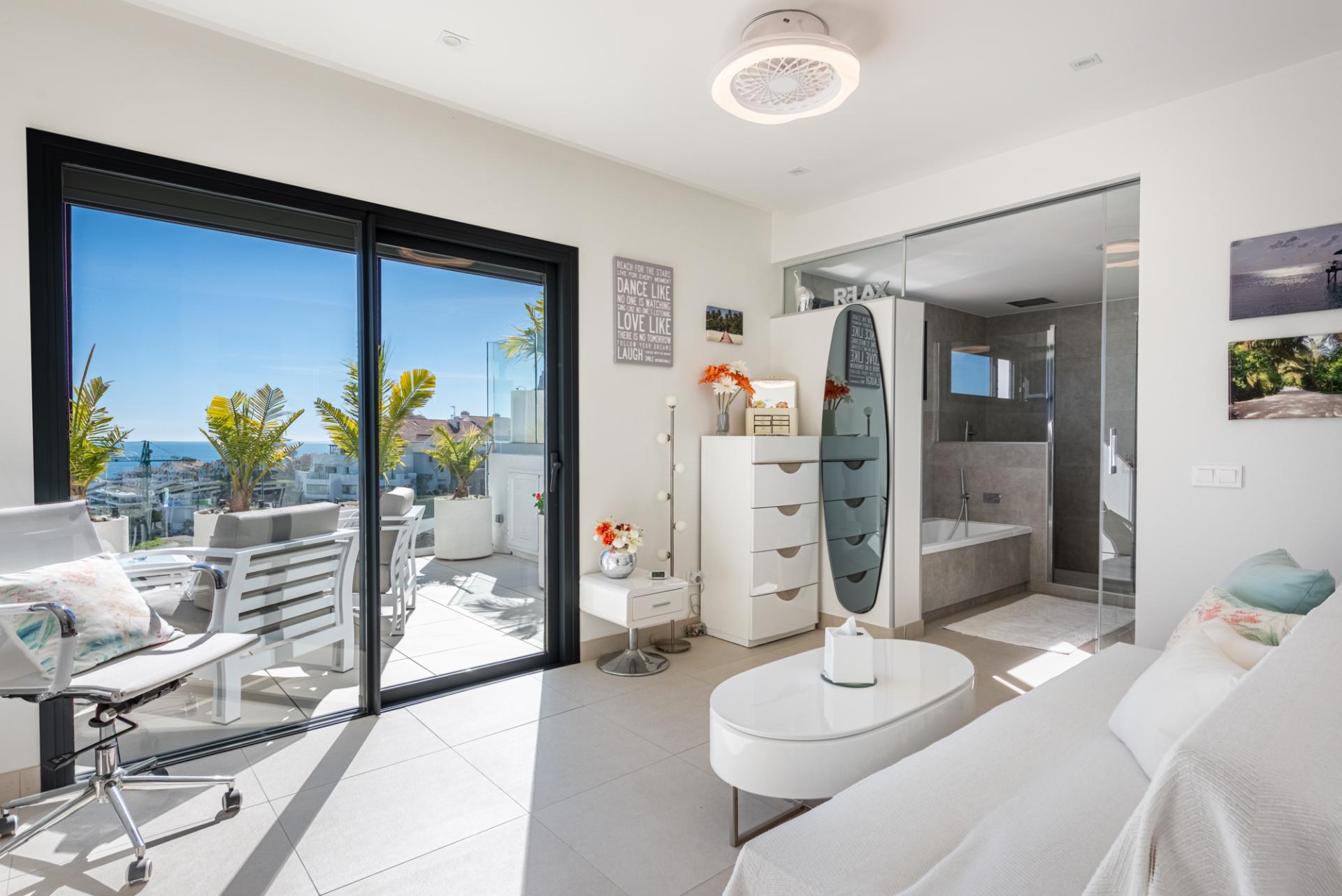 There are two bedrooms, both with ample fitted wardrobes. The master takes advantage of the far reaching Med views and enjoys a large en-suite with both a deep bath, separate walk-in shower and spacious sink unit with deep drawers beneath. The guest bedroom has its own private terrace facing the Mijas mountains.