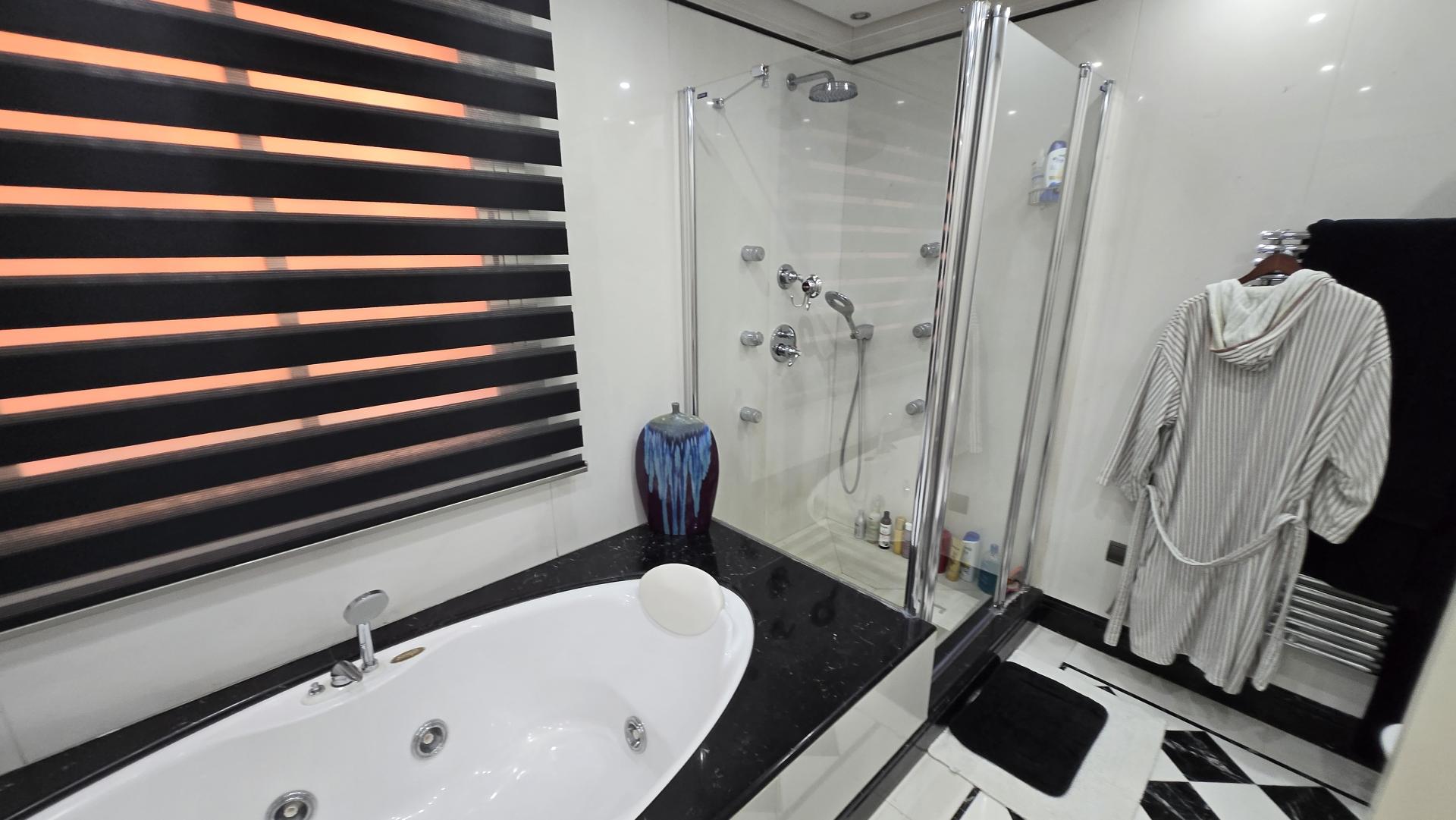 Luxurious features include air conditioning, marble floors, fitted wardrobes, a dressing room, double glazing, and an elevator. The communal areas offer first-class facilities such as a gym, sauna, and spa, ensuring an exclusive living experience with a focus on wellness.