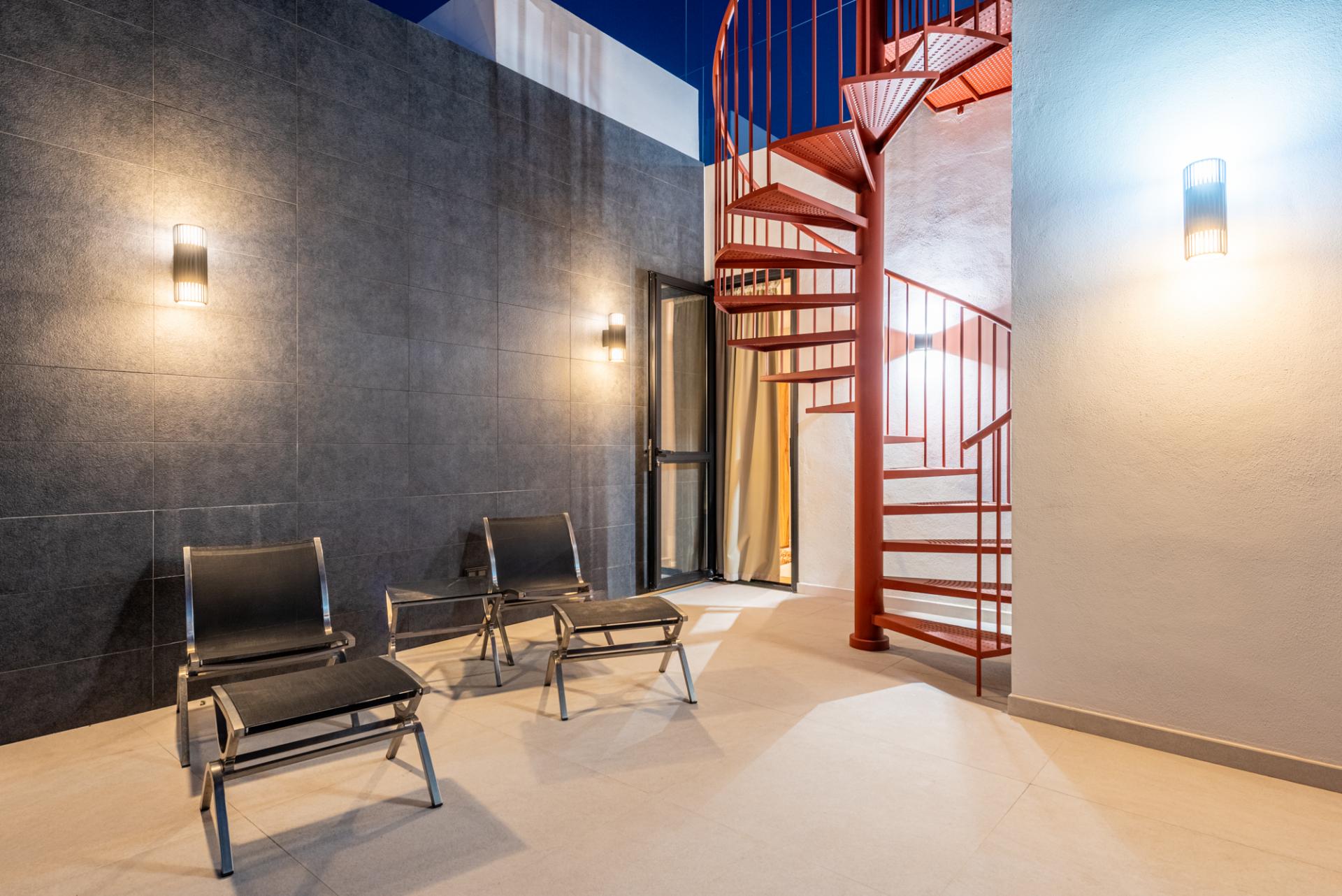 Upstairs, you’ll find two expansive bedroom suites, each with its own en-suite bathroom and direct access to a large terrace offering breathtaking views. A separate south-facing terrace leads to a spiral staircase taking you up to the impressive roof terrace.