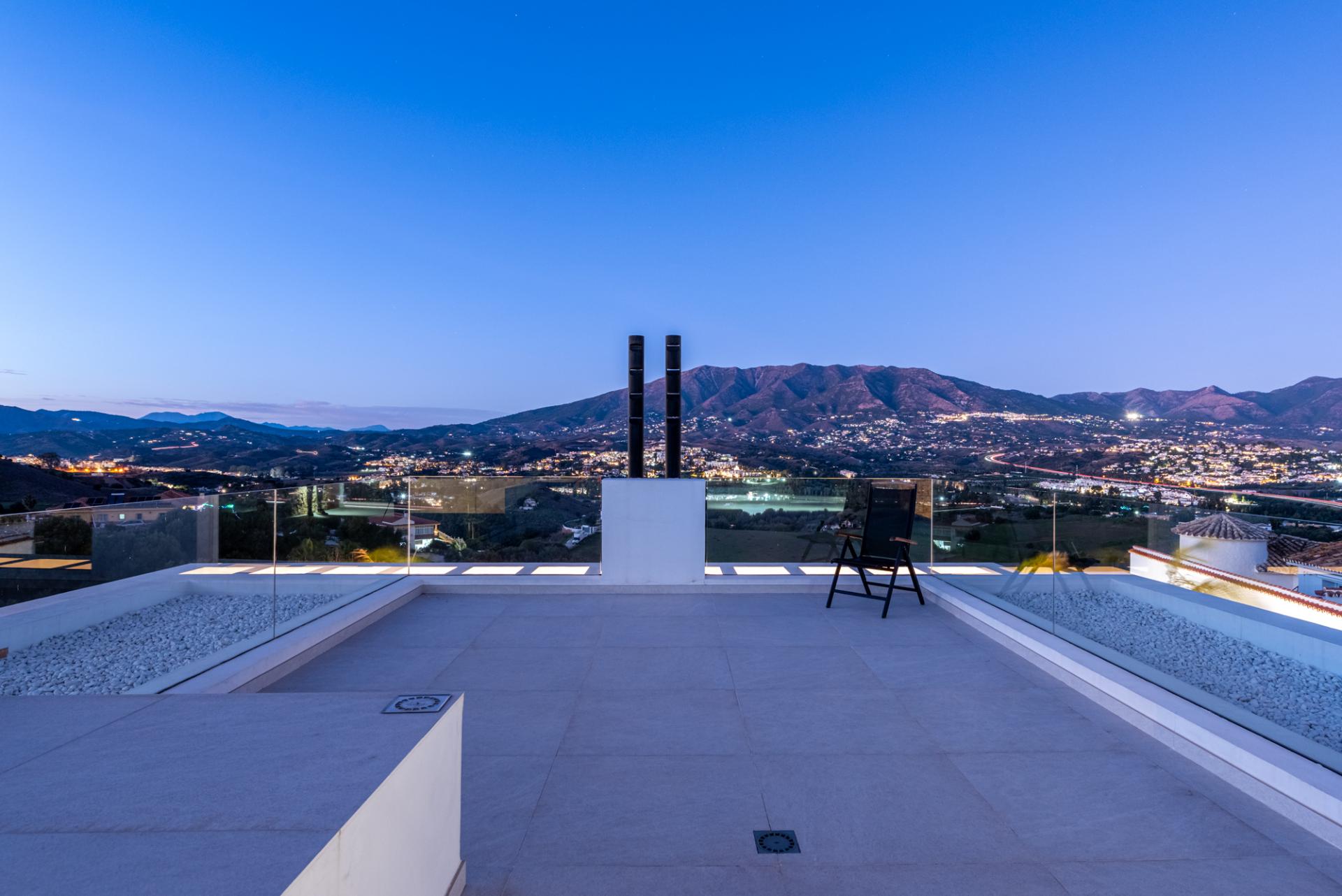 The spacious rooftop solarium boasts uninterrupted 360-degree views of the valley, mountains, and the sea. It is an ideal space for installing a jacuzzi, creating a chill-out lounge, or simply enjoying peaceful sunsets in total privacy.