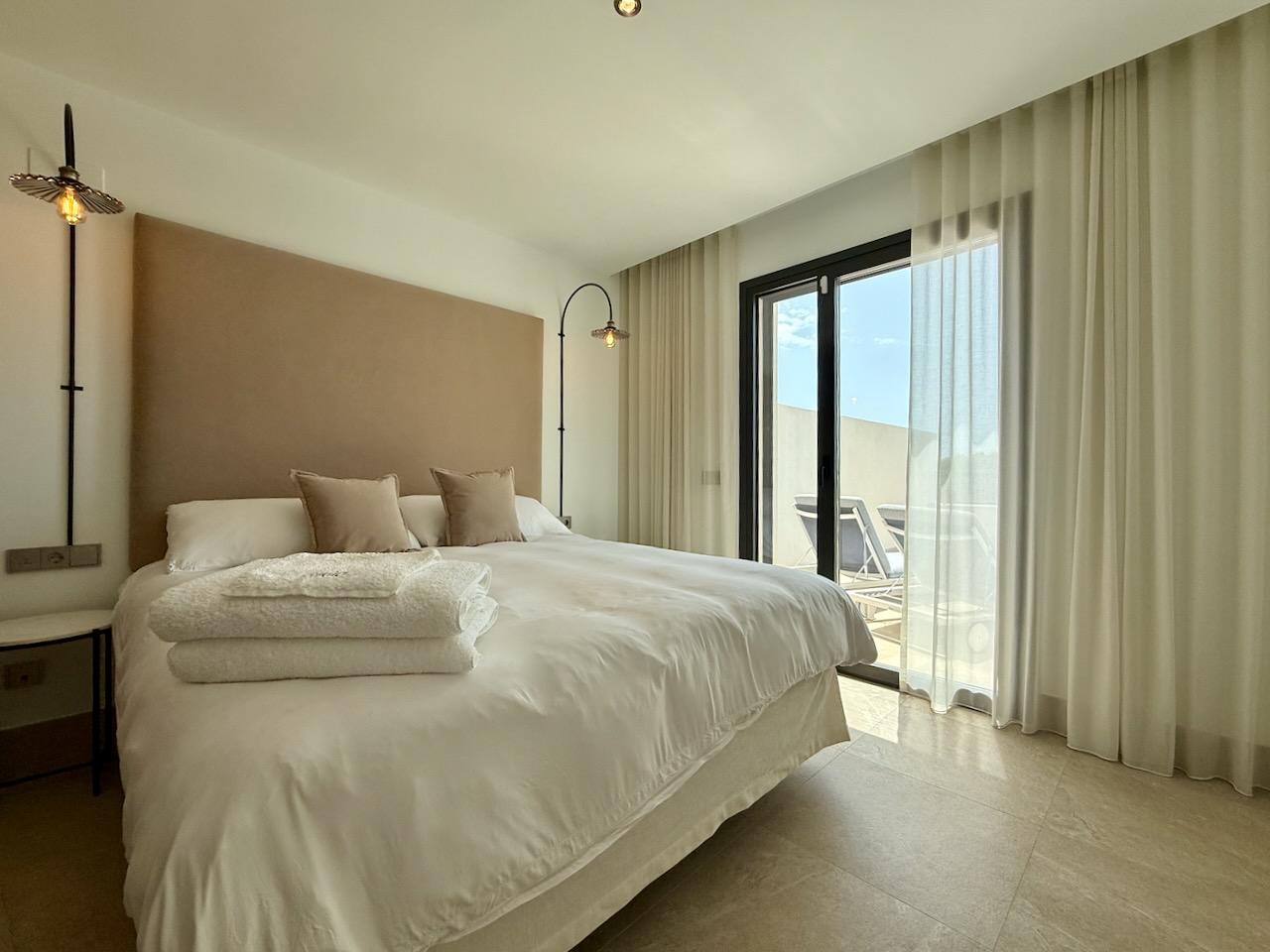The modern open-plan living space connects to a fully equipped kitchen and dining area, while the master suite includes an en suite bathroom and direct access to the terrace. Two additional bedrooms and a second bathroom offer space and flexibility for guests or family.