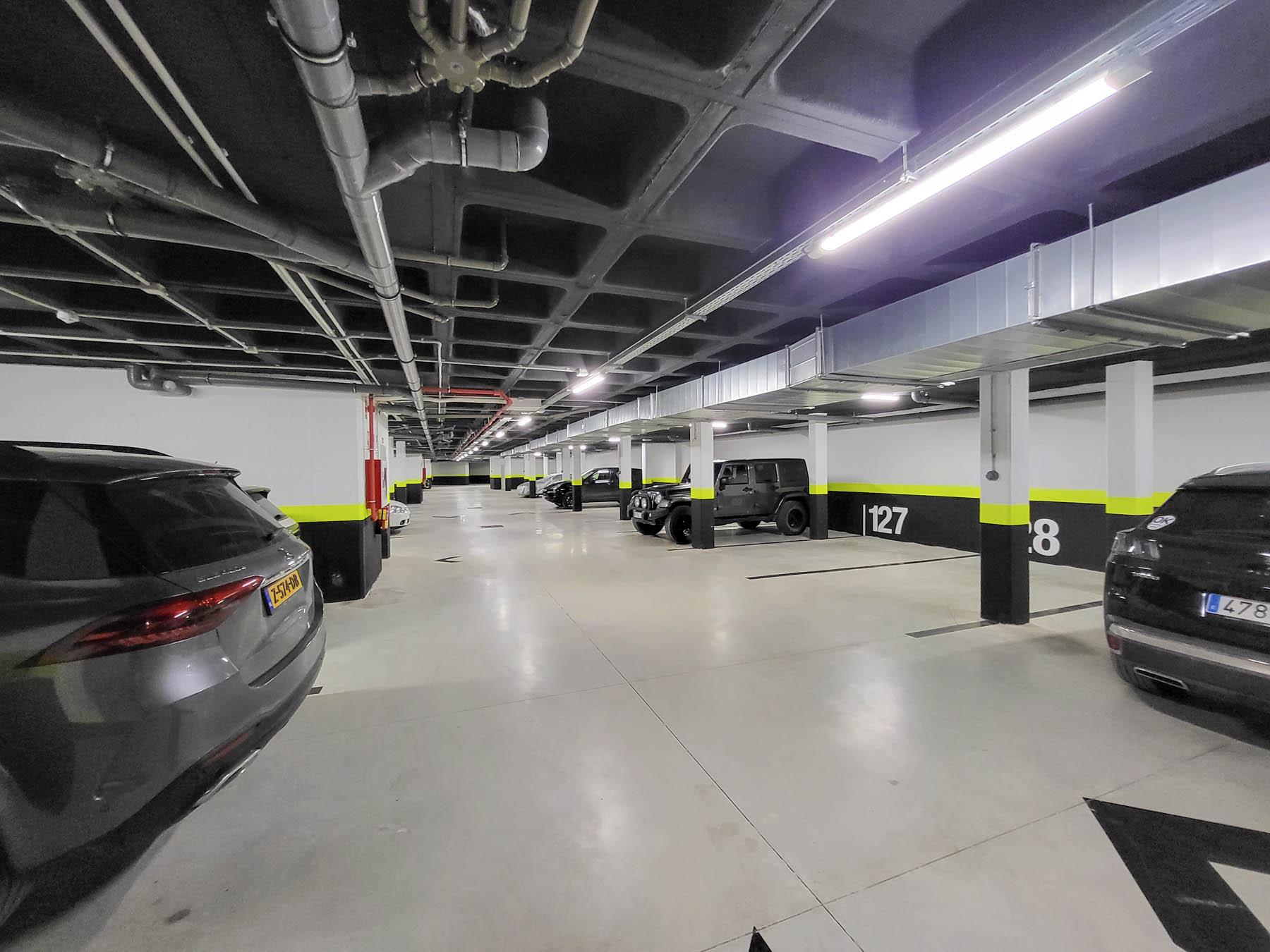 Two large parking spaces, one of which includes an electric/hybrid car charging station and a dedicated storage unit.