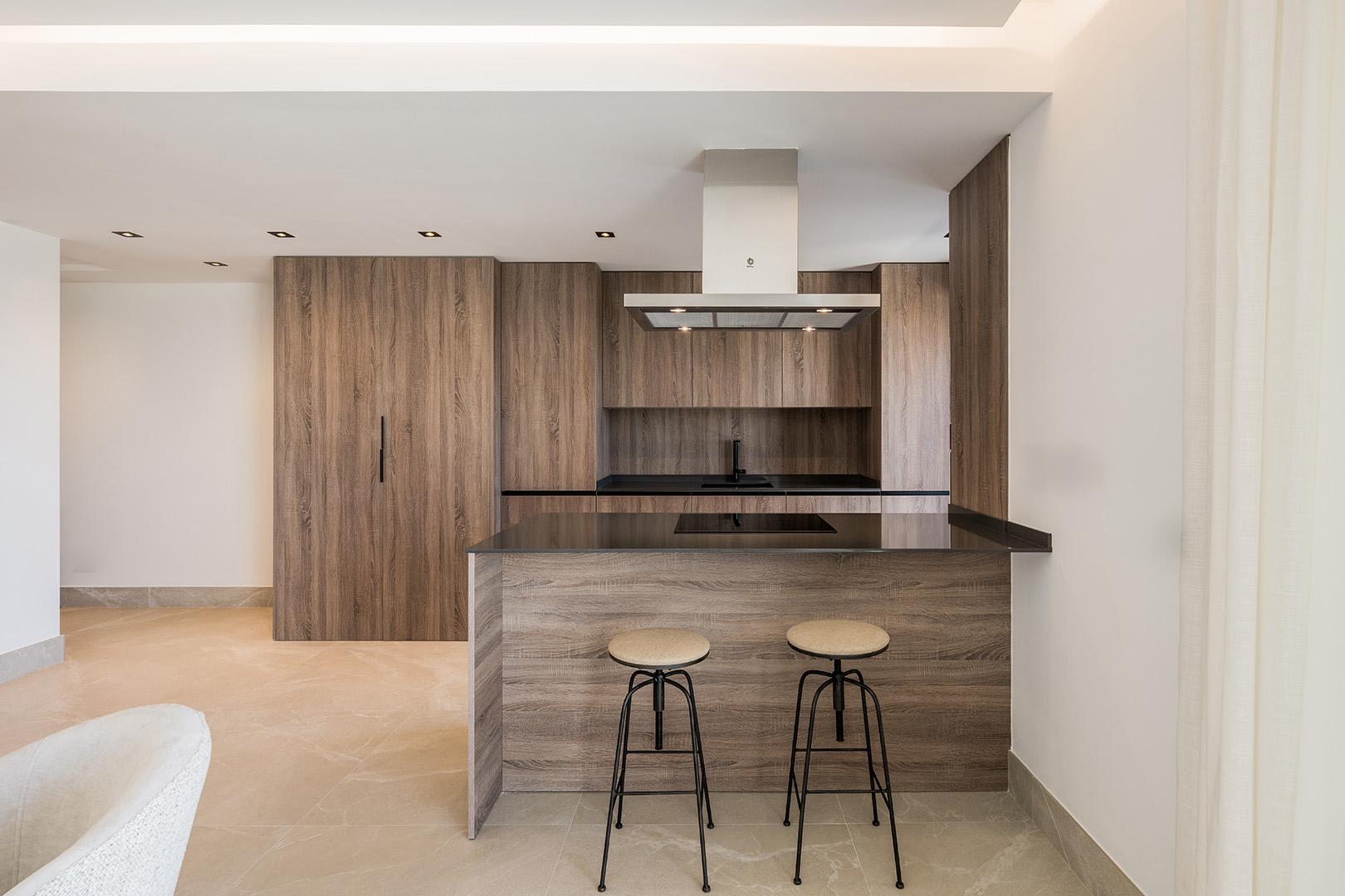 Inside, the open-plan design links a stylish kitchen, dining and living area to a sunlit terrace through expansive sliding glass doors. Neutral large-format stone tiles and warm wood accents create an elegant yet cosy atmosphere. The kitchen features custom cabinetry, an island with hob and breakfast bar, generous worktops and Balay appliances. Three tranquil bedrooms and two well-appointed bathrooms complete the interior, all furnished to complement the home’s soft, natural palette.
