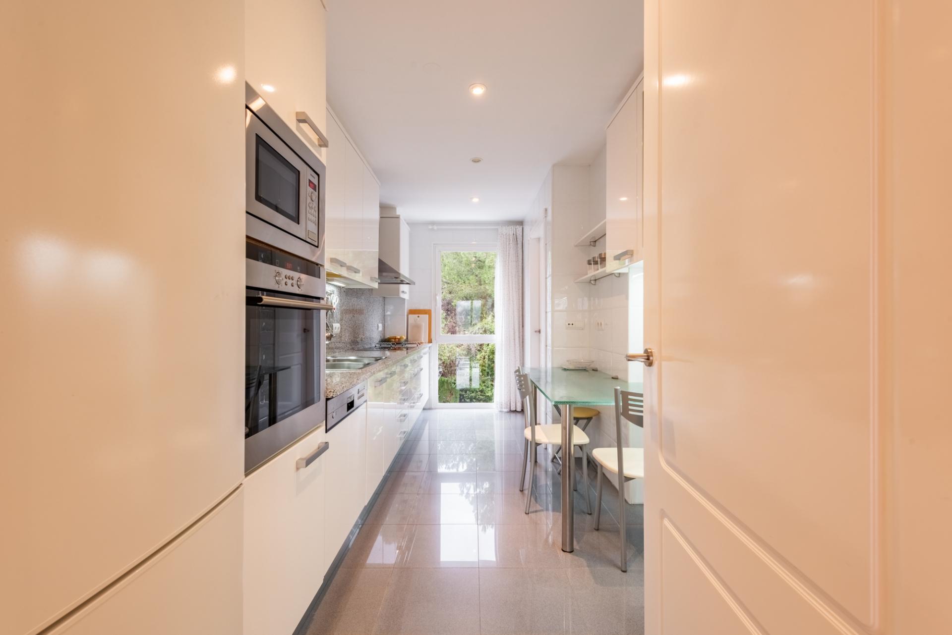 Impeccably maintained and designed for comfort, the apartment features a welcoming entrance hall, a generous living room with direct terrace access, a fully equipped kitchen with adjoining utility room, and three well-appointed bedrooms. The master suite includes a walk-in closet and en-suite bathroom, complemented by a guest bedroom with its own en-suite and a third bedroom with a separate bathroom.