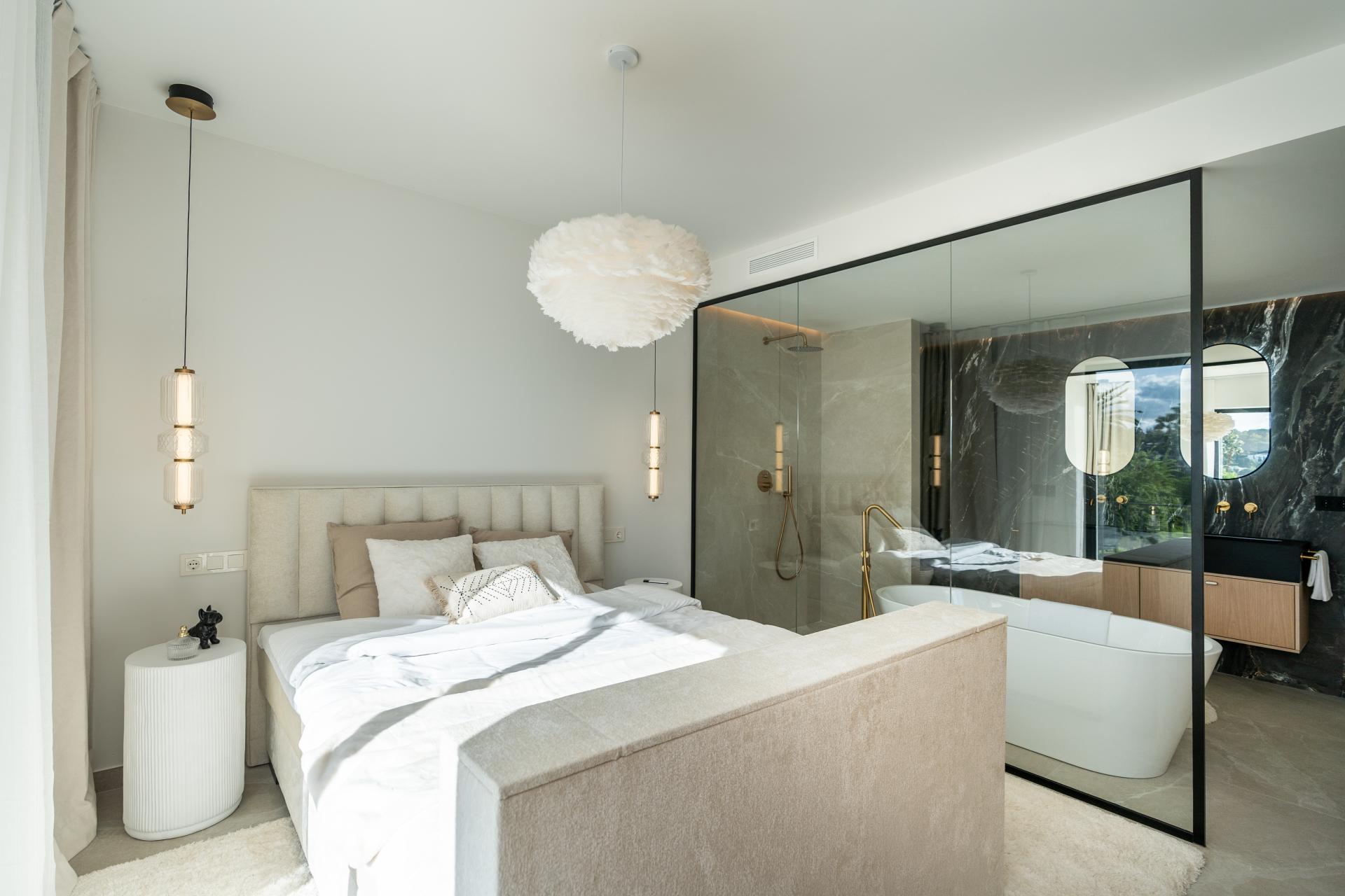 Distributed over two floors, Casa Preciosa has been totally refurbished and decorated to a high standard and with quality design. Accommodation comprises, on the garden level: lovely entrance patio, hallway, two guest bedrooms sharing a bathroom, guest toilet with enclosed utility room, open plan living area including the sleek designer fully fitted and equipped kitchen, leading on to the charming terrace enjoying pleasant garden and pool views and with direct access to the beautiful grounds. An elegant staircase leads to the first floor, comprising the master suite with a terrace overlooking the gardens and pool towards the Golf Valley and the mountains, plus a guest bedroom with en suite bathroom.