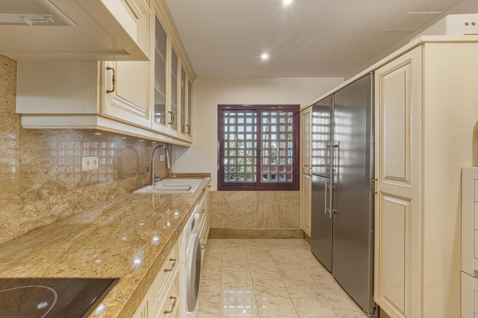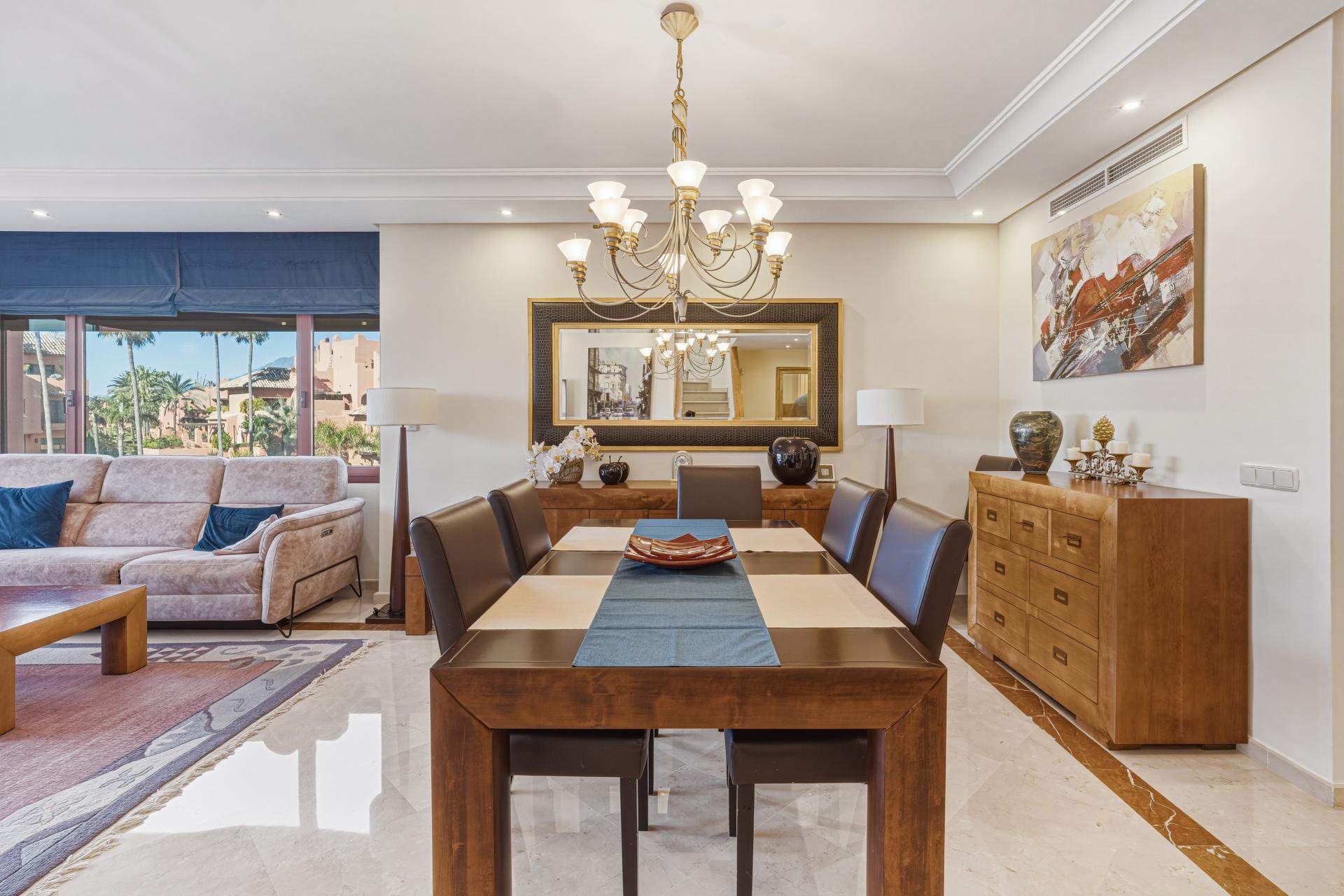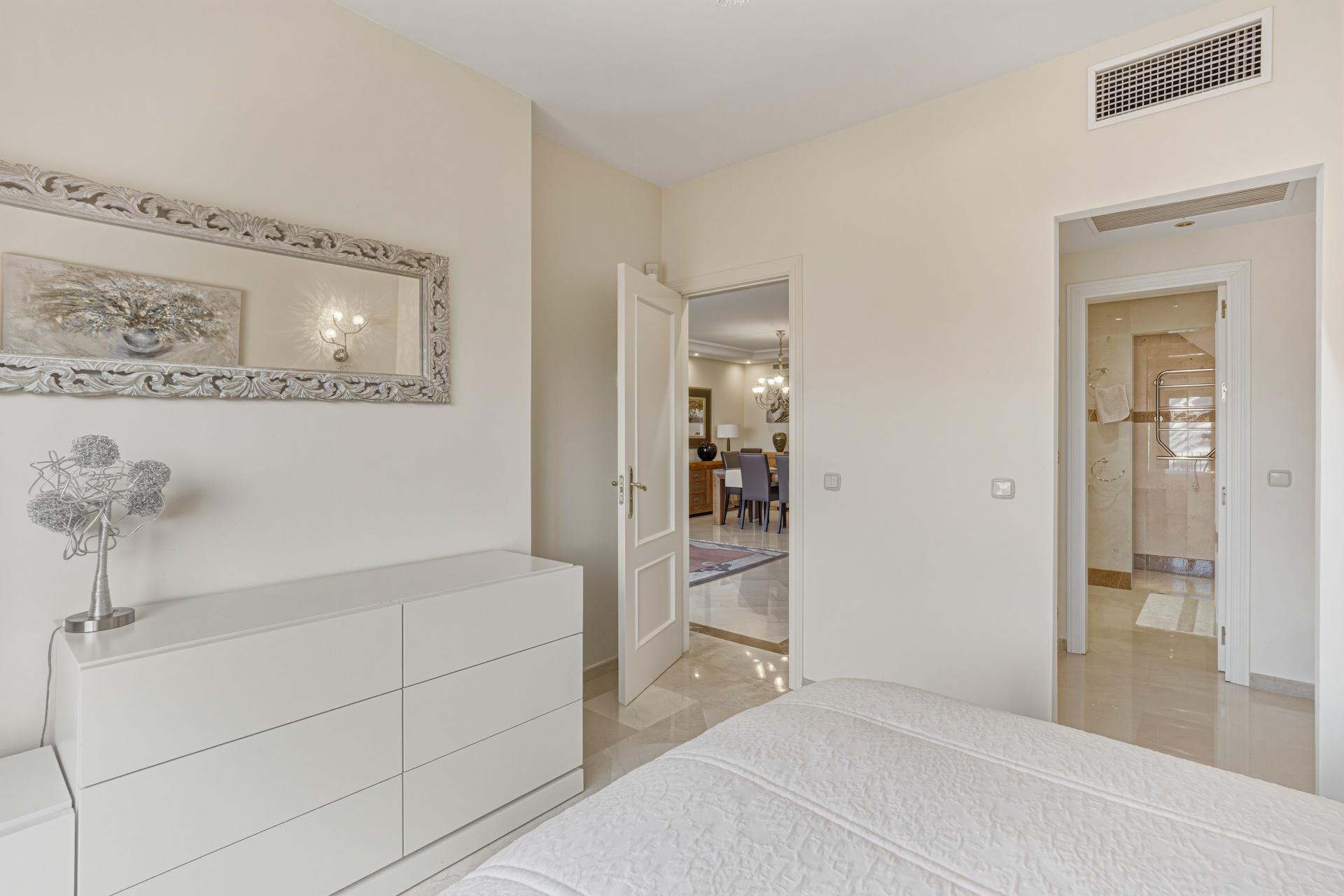 Bright and spacious, south west facing three-bedroom duplex penthouse located in the prestigious gated beachfront community of Menara Beach, New Golden Mile, Estepona East. The complex is just a ten-minute drive to Puerto Banus and close to shops, restaurants, and all amenities. Menara Beach features beautifully maintained tropical gardens, an outdoor communal swimming pool, an indoor heated pool, and a gymnasium. The property offers a bright open-plan living and dining area with patio doors leading to a private terrace with lovely sea views, a fully fitted kitchen with breakfast bar, a guest suite with terrace access, an additional guest bedroom, and a guest bathroom. Upstairs, the spacious master suite boasts vaulted ceilings as well as access to two large terraces including a BBQ area and stunning views of the community and the sea. Further features include fitted wardrobes, marble floors, hot and cold air conditioning, underfloor heating throughout, private parking, and a storeroom.