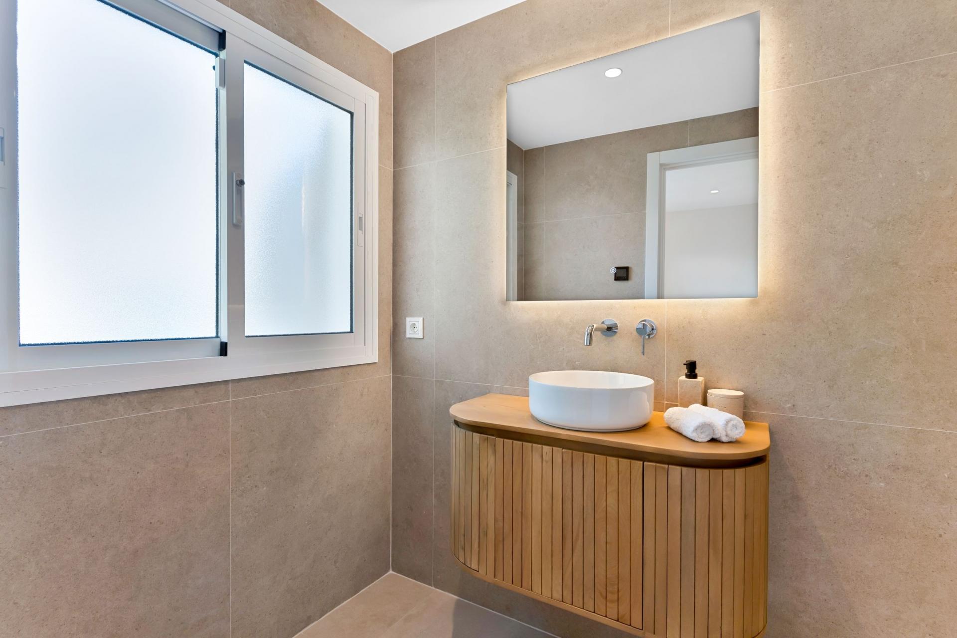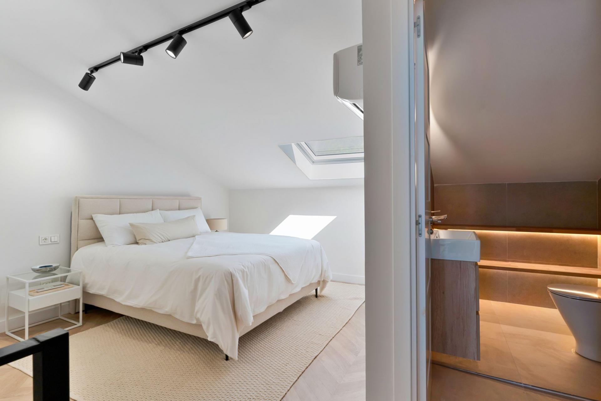 Inside, the ground floor spans nearly 80 m², comprising a stylish open-plan kitchen, spacious living room, entrance hall, and guest toilet. Scandinavian design principles define the space, with carefully selected, high-quality modern materials. Under the staircase, there’s a custom wine storage area. All rooms are fitted with individually controlled Airzone systems for both heating and cooling, while underfloor heating is installed in all bathrooms. Wet areas are finished with tasteful, full-height tiles in a warm beige tone.