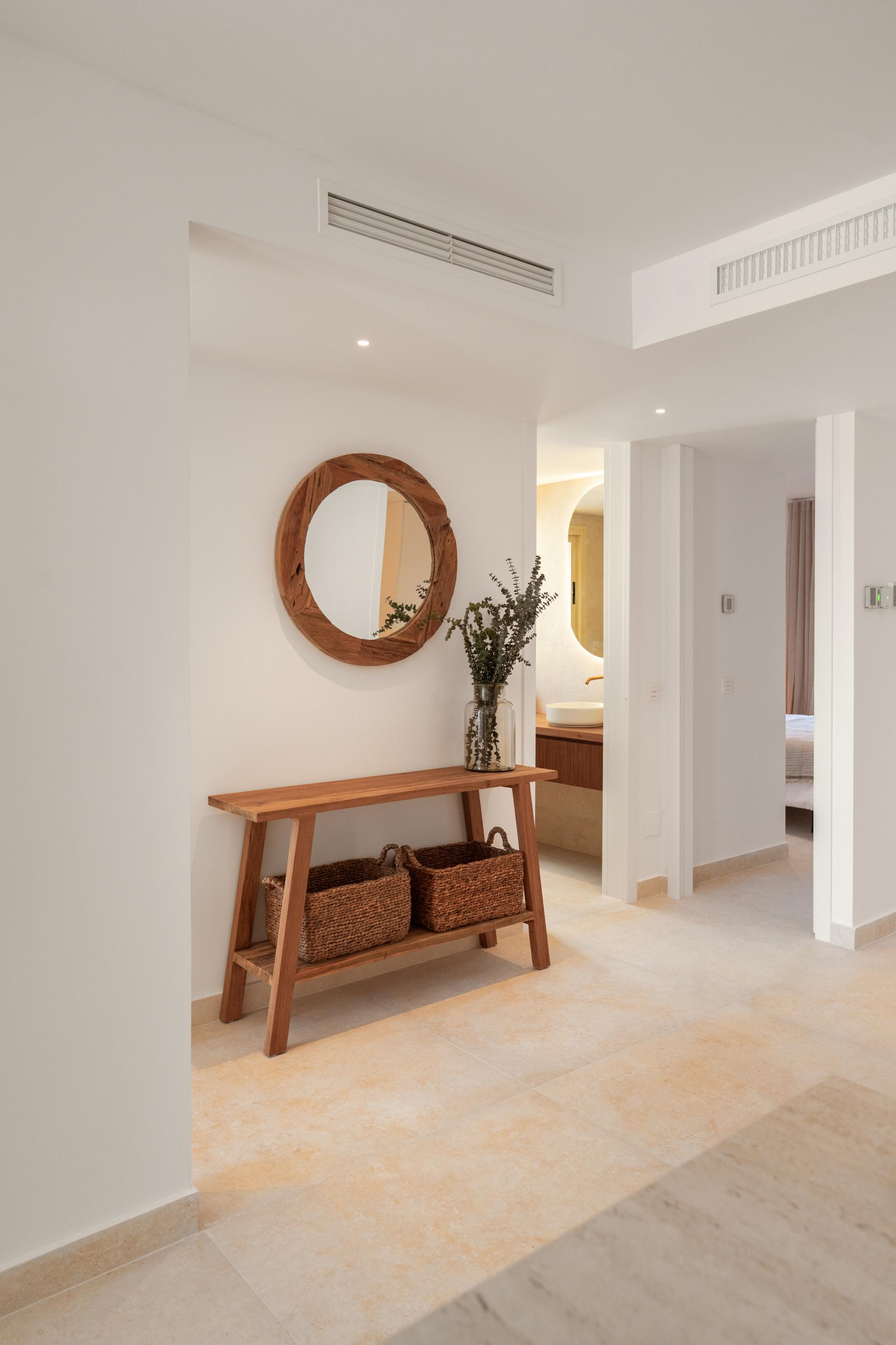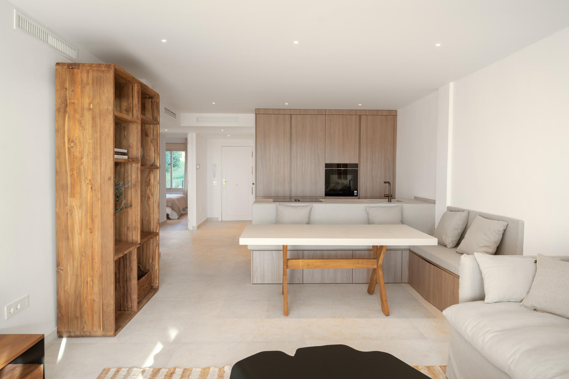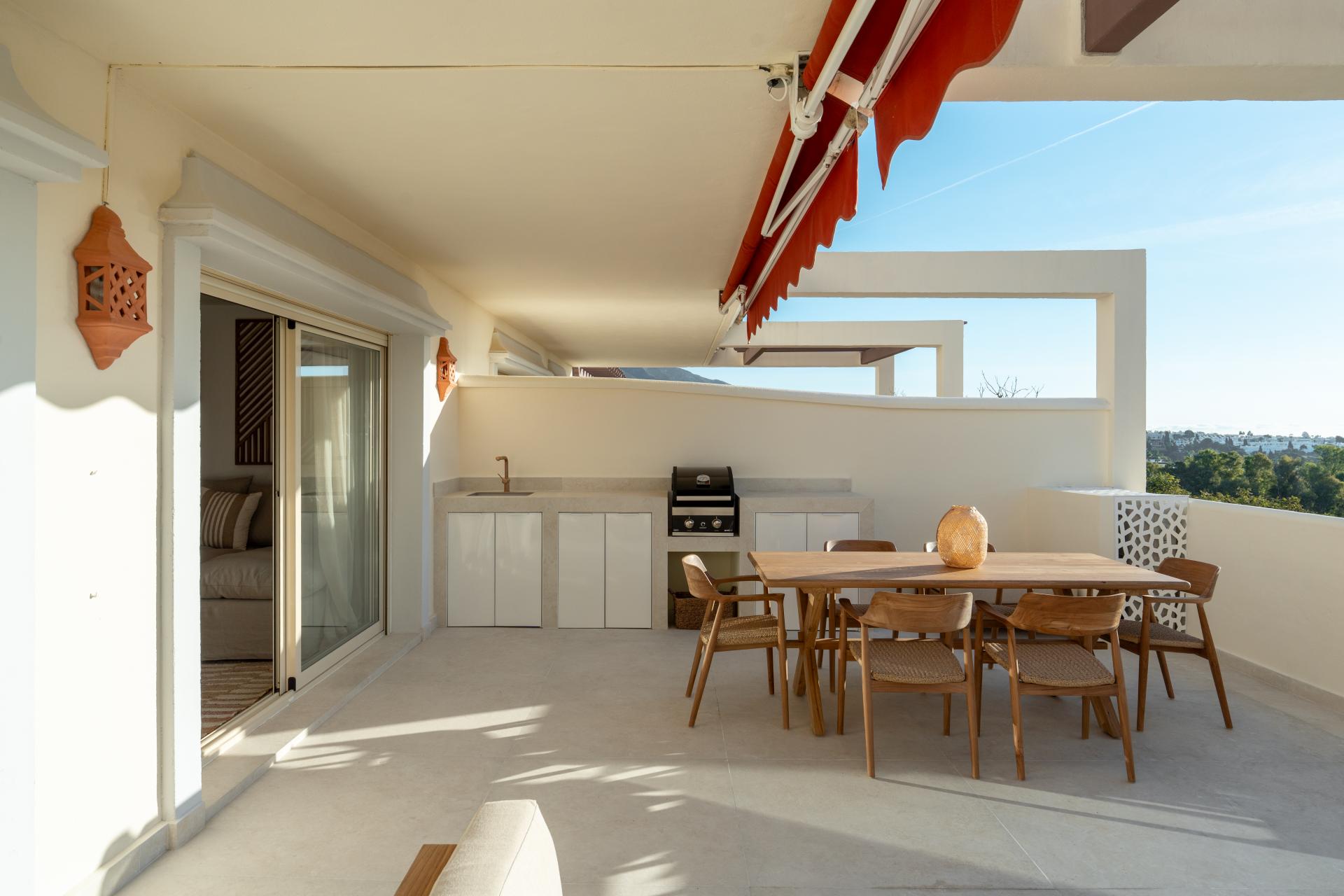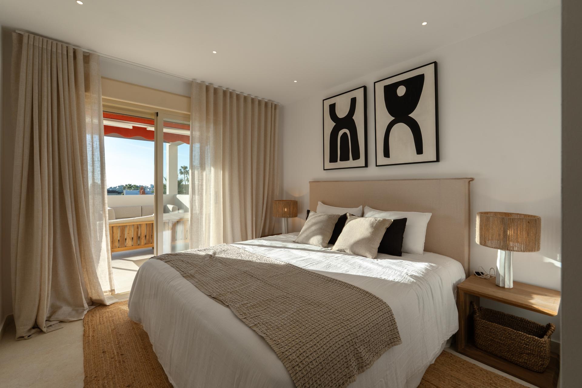This stunning three-bedroom first floor apartment, located in the sought-after area of Nueva Andalucía, Marbella, offers an exceptional blend of etnic-Scandinavian, boho design, comfort, and elegance. Fully refurbished to an impeccable standard, the property boasts a bright open-plan living and dining space, thoughtfully created for both everyday living and effortless entertaining.