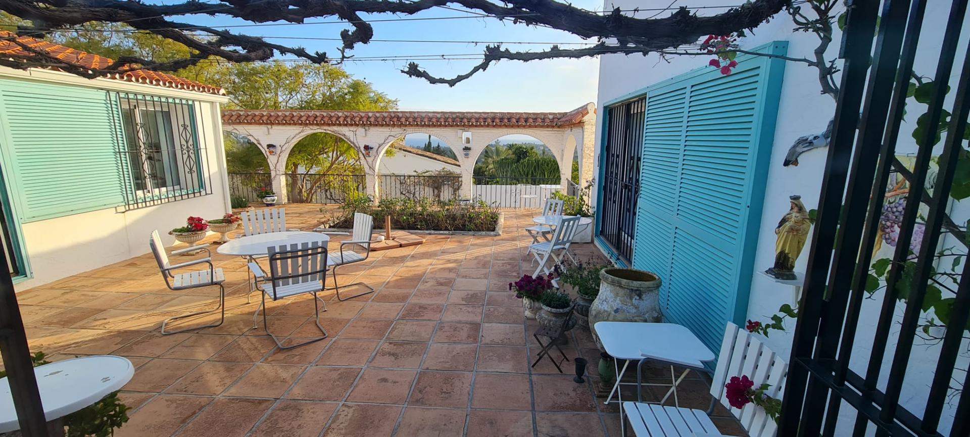 Outdoor living is equally impressive, with expansive terraces totalling 120m²—both covered and uncovered—perfect for alfresco dining or taking in the breathtaking views. The mature, automatically irrigated gardens with various fruit trees surround a private swimming pool, and a barbecue area provides additional entertaining options. The property also includes a private garage and ample parking. Security is prioritised with an alarm system and window bars.