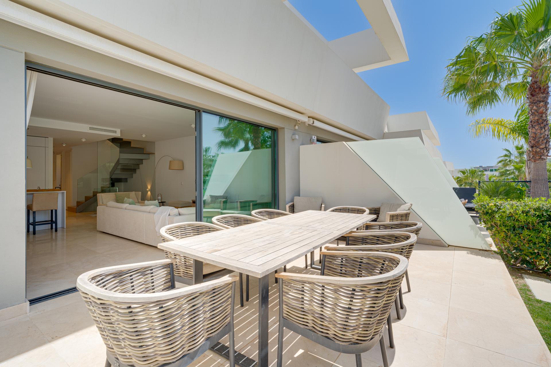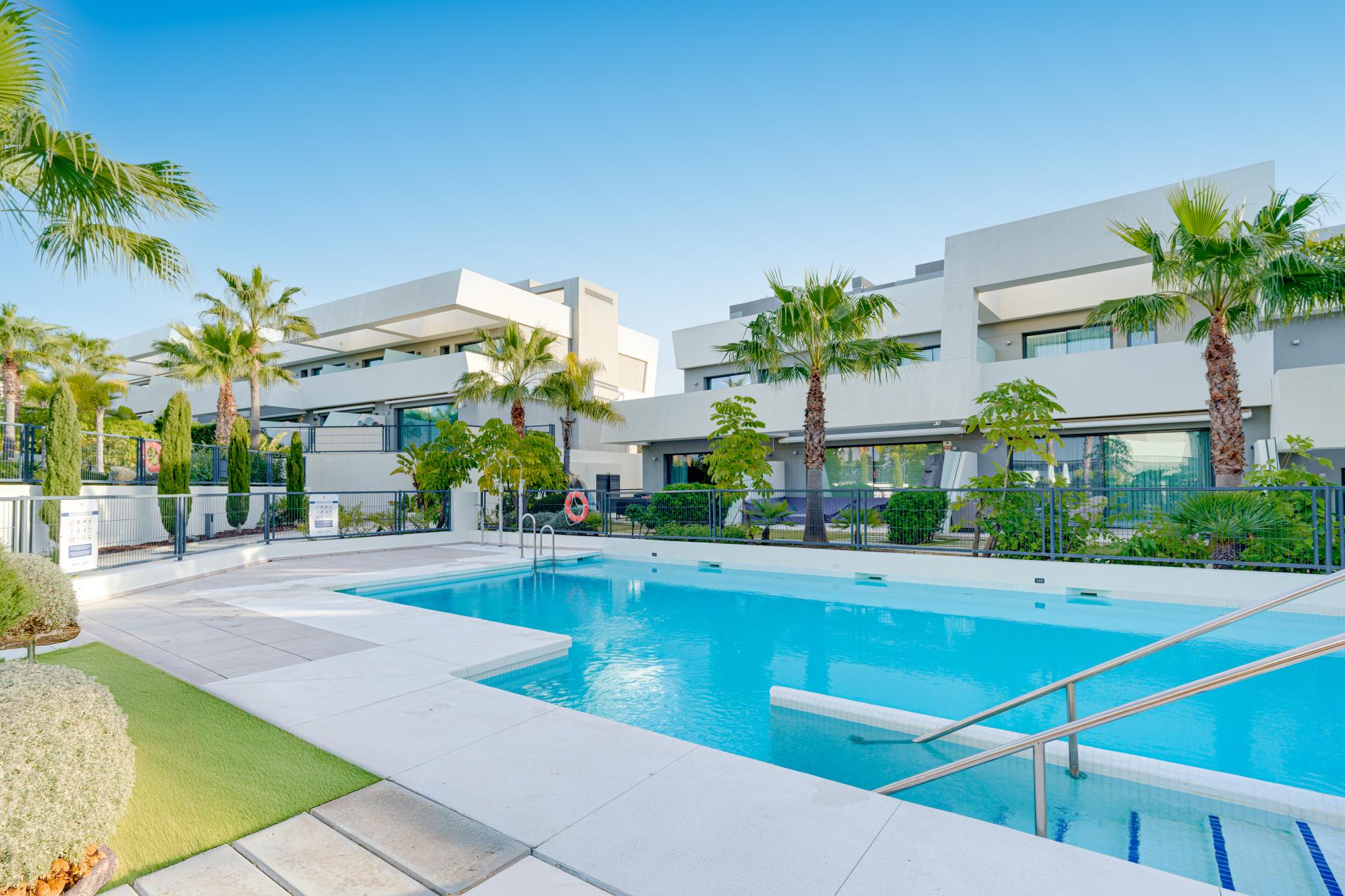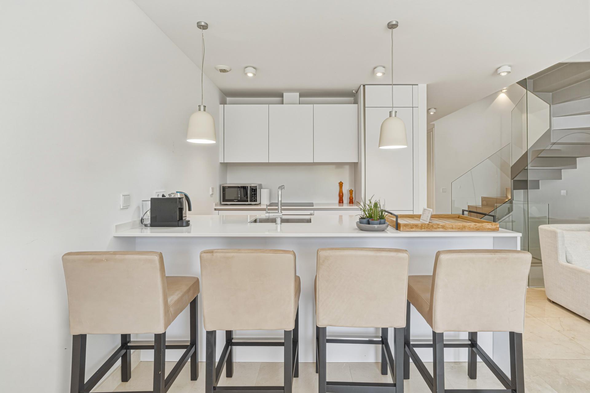 La planta baja cuenta con una luminosa sala de estar y comedor de planta abierta con una cocina moderna totalmente equipada, que se abre a un jardín privado con acceso directo a la piscina comunitaria, creando un estilo de vida interior ideal. Este nivel también incluye un dormitorio de invitados y un baño completo. En la primera planta, la propiedad ofrece una amplia suite principal con terraza privada, dos dormitorios adicionales y un elegante baño compartido. El nivel superior conduce a un generoso solárium privado, completo con una zona de barbacoa y piscina sumergible, perfecto para relajarse o entretenerse. El nivel inferior ofrece una gran sala multiusos, ideal para un gimnasio o sala de juegos, junto con un lavadero, área de almacenamiento y acceso interno directo al garaje. Otras características incluyen aire acondicionado frío y caliente, dos plazas de aparcamiento privado y servicio de conserjería. Esta propiedad ofrece una combinación perfecta de diseño contemporáneo, comodidad y una ubicación privilegiada.