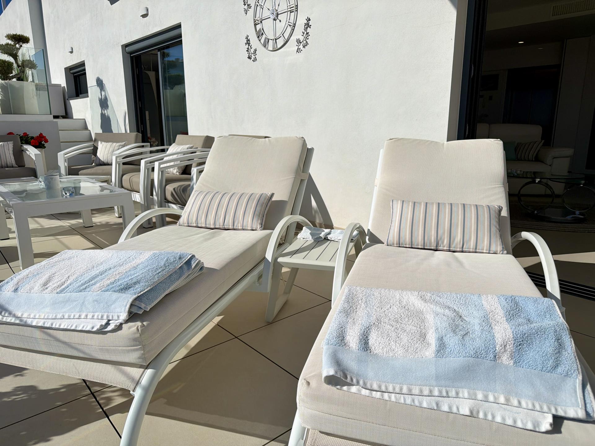 La terraza solárium ofrece auténticas vistas panorámicas de 360 grados, con una perspectiva incomparable sobre el campo de golf Calanova, el mar Mediterráneo y las montañas que rodean la zona.