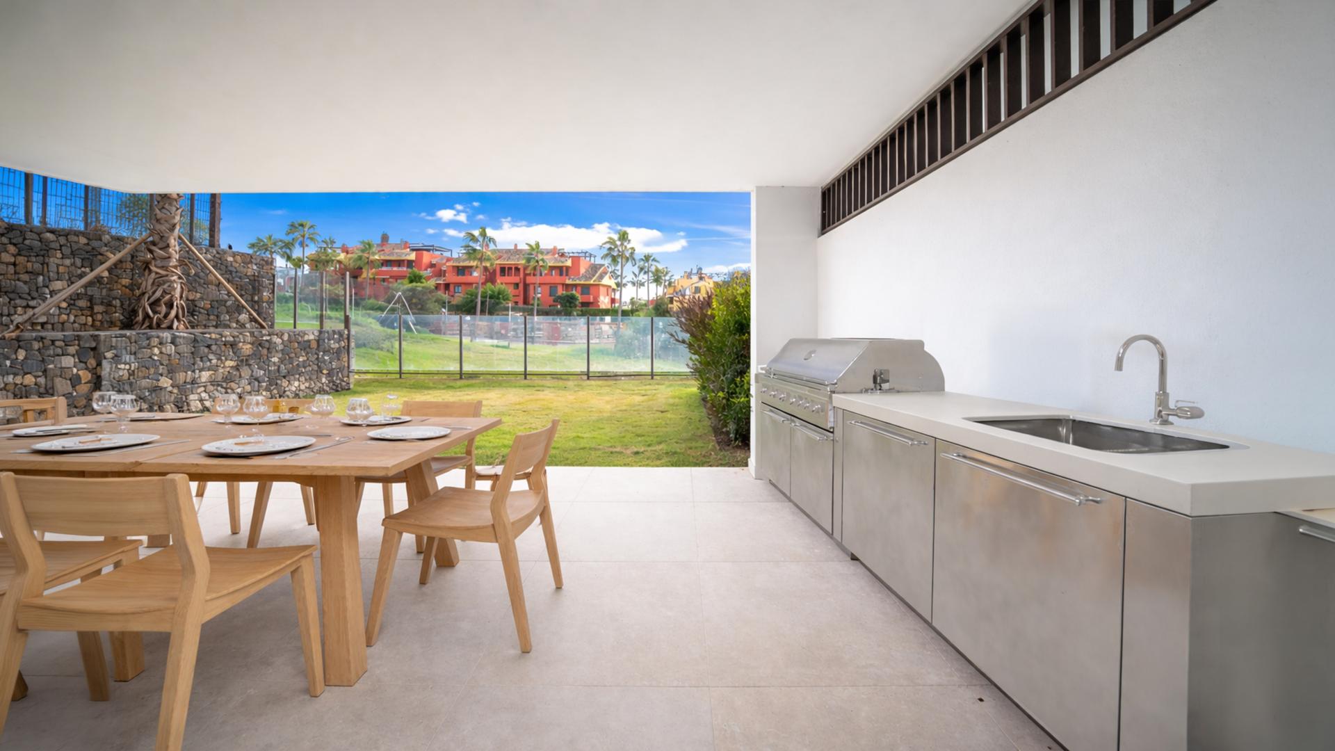 El apartamento cuenta con un luminoso espacio de estar de concepto abierto que se integra perfectamente con una amplia terraza cubierta con cocina exterior, creando un estilo de vida ideal de interior y exterior. El jardín en esquina aporta privacidad y espacio adicional al aire libre, perfecto para relajarse o recibir invitados.