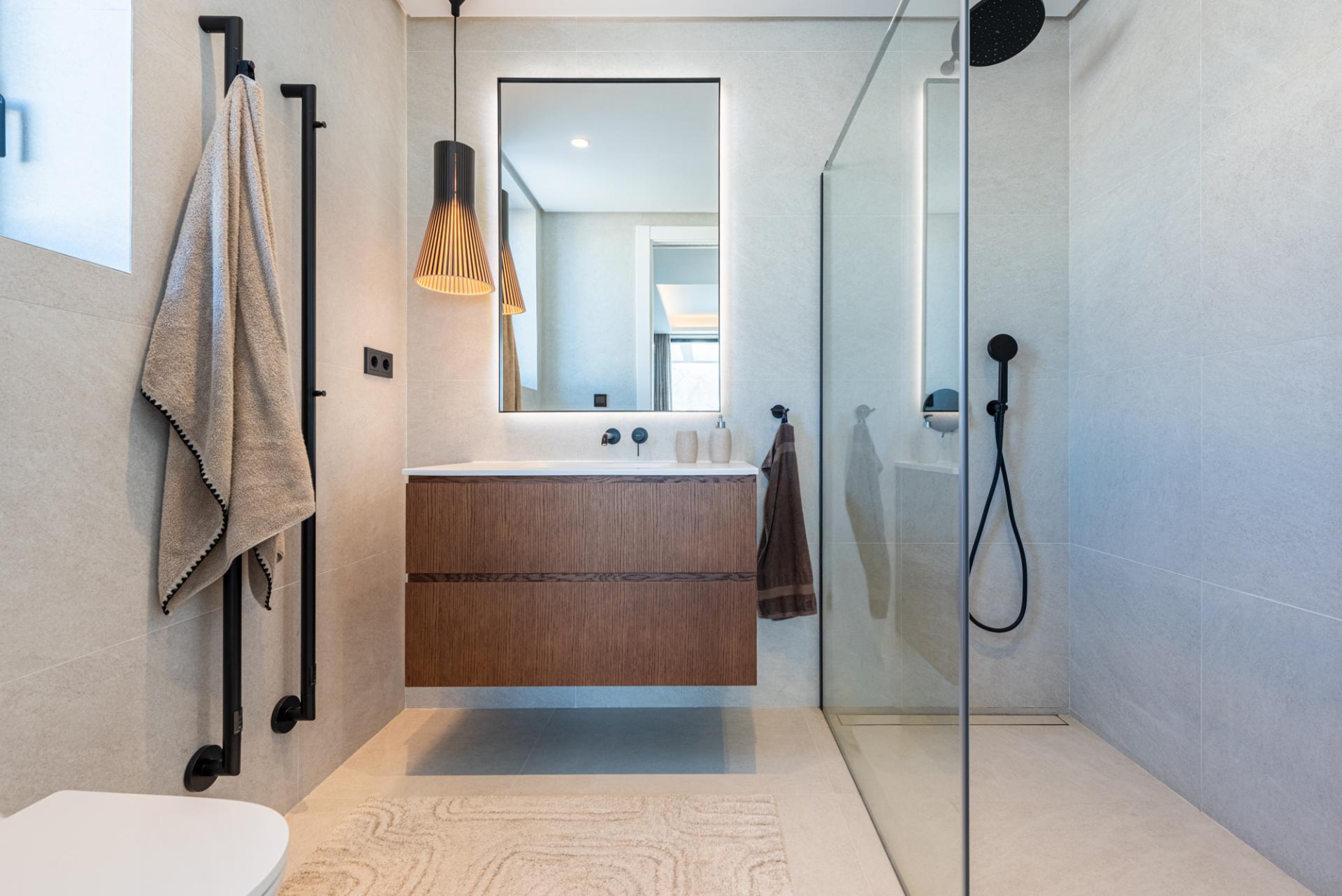 En la planta superior se encuentran dos amplios dormitorios en suite, cada uno con su propio baño privado y acceso directo a una gran terraza con vistas impresionantes. Una terraza adicional orientada al sur conecta con una escalera de caracol que conduce al magnífico solárium.