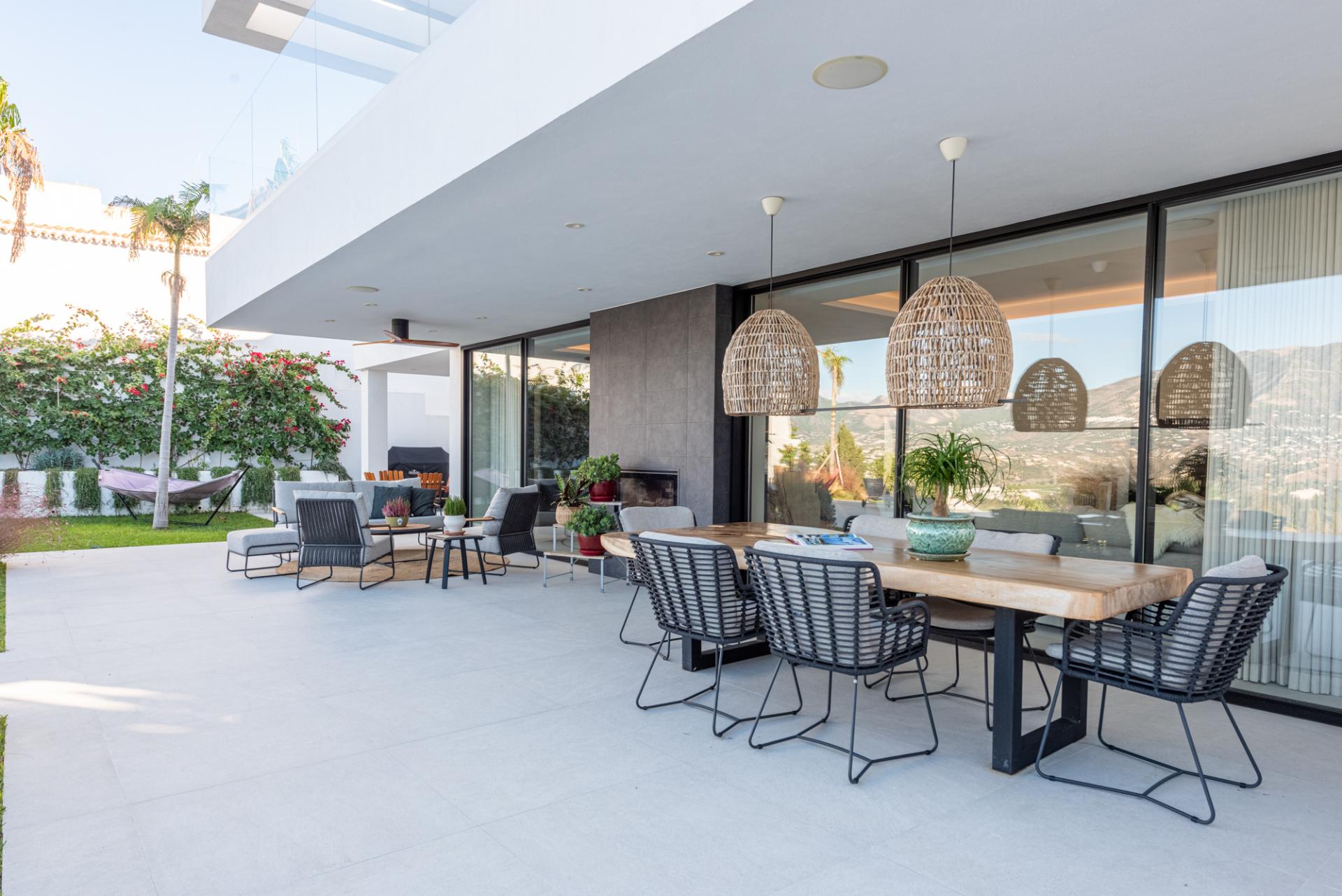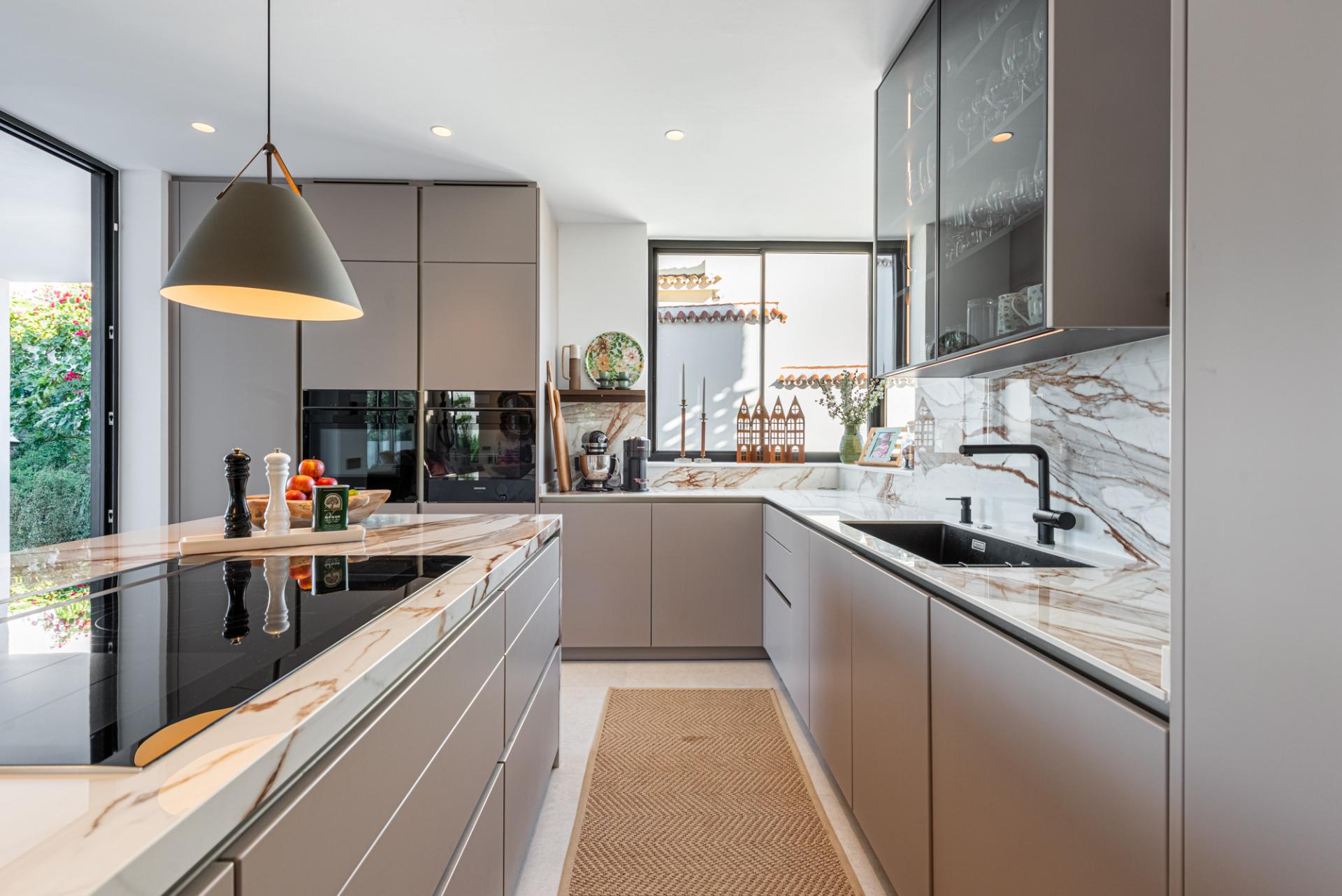 En la planta de entrada se encuentra un amplio salón y una cocina de diseño en concepto abierto, con ventanales de suelo a techo que enmarcan las espectaculares vistas a la montaña. Desde aquí, los espacios interiores se conectan de forma natural con el jardín cuidadosamente diseñado y la piscina infinita climatizada de agua salada.