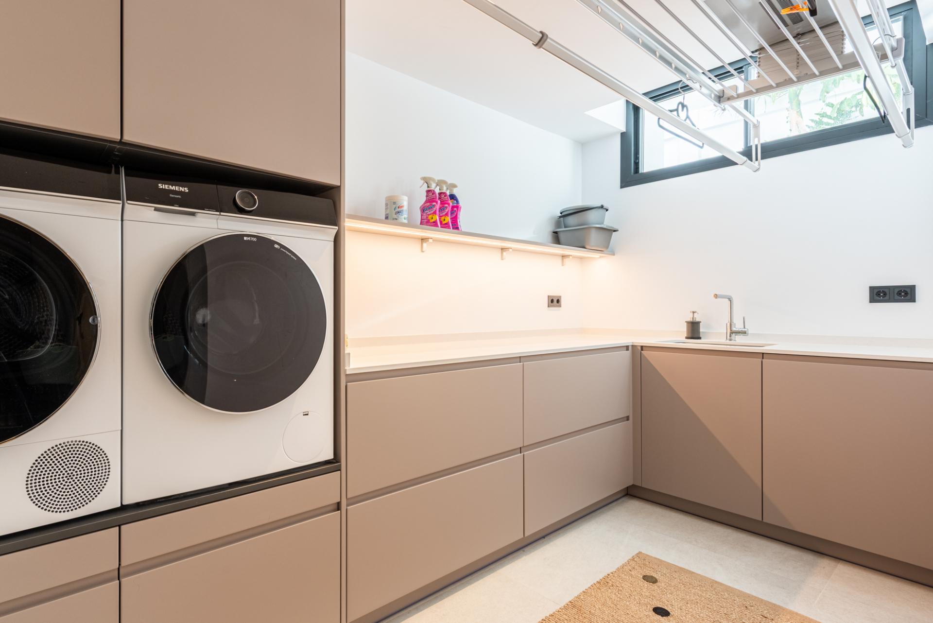 La planta baja ofrece amplias zonas adicionales, incluyendo varias salas de almacenamiento, lavadero, sala de máquinas y un gran garaje con capacidad para más de cuatro coches. Este nivel también presenta múltiples posibilidades de personalización: puede transformarse en un cine privado, gimnasio, bodega o incluso un apartamento independiente para invitados.