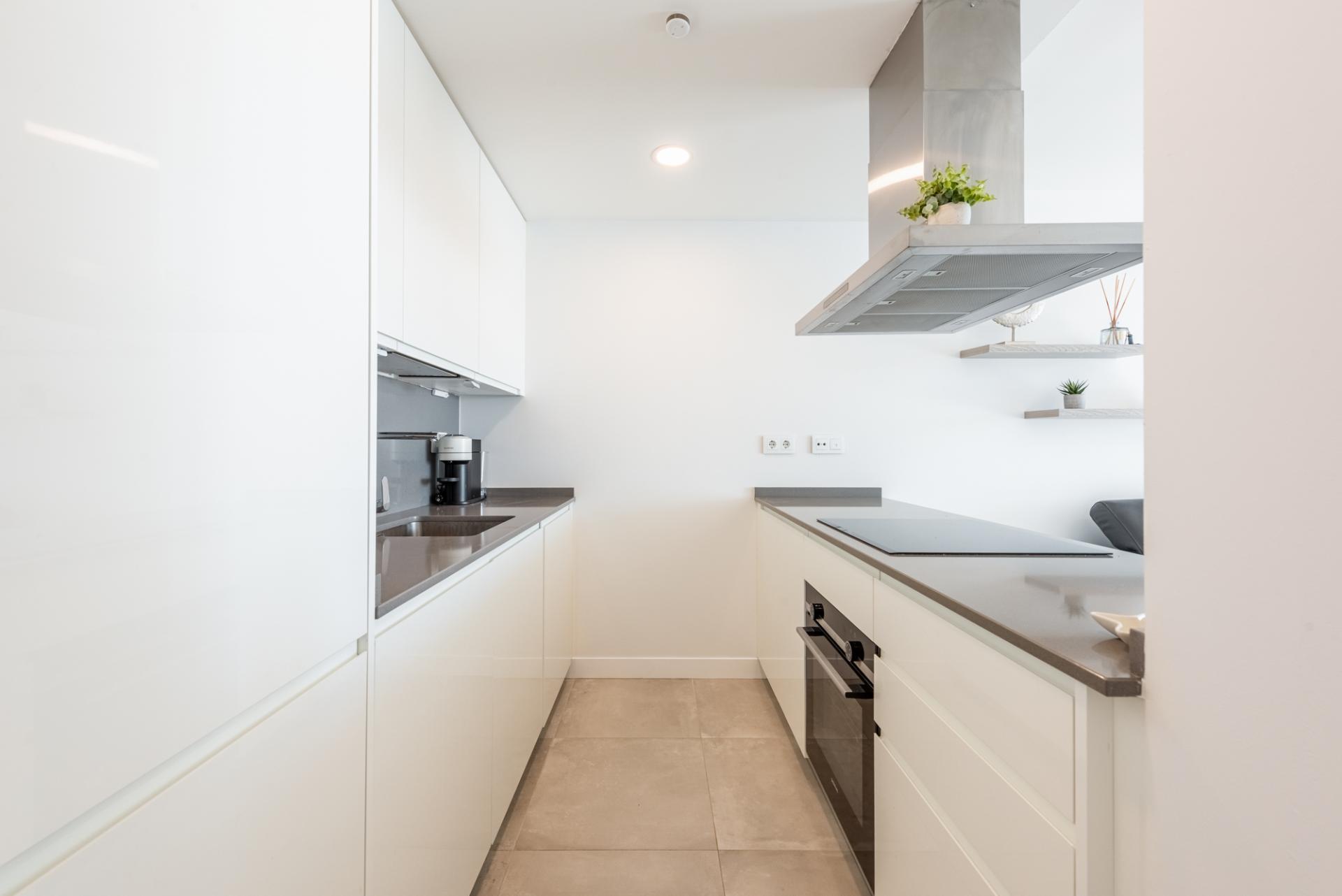 En su interior, la distribución de concepto abierto cuenta con un amplio salón que se integra perfectamente con la terraza orientada al suroeste, ideal para relajarse o comer al aire libre disfrutando de las vistas al mar. La cocina moderna está equipada con electrodomésticos integrados y una isla península, combinando funcionalidad con diseño contemporáneo.