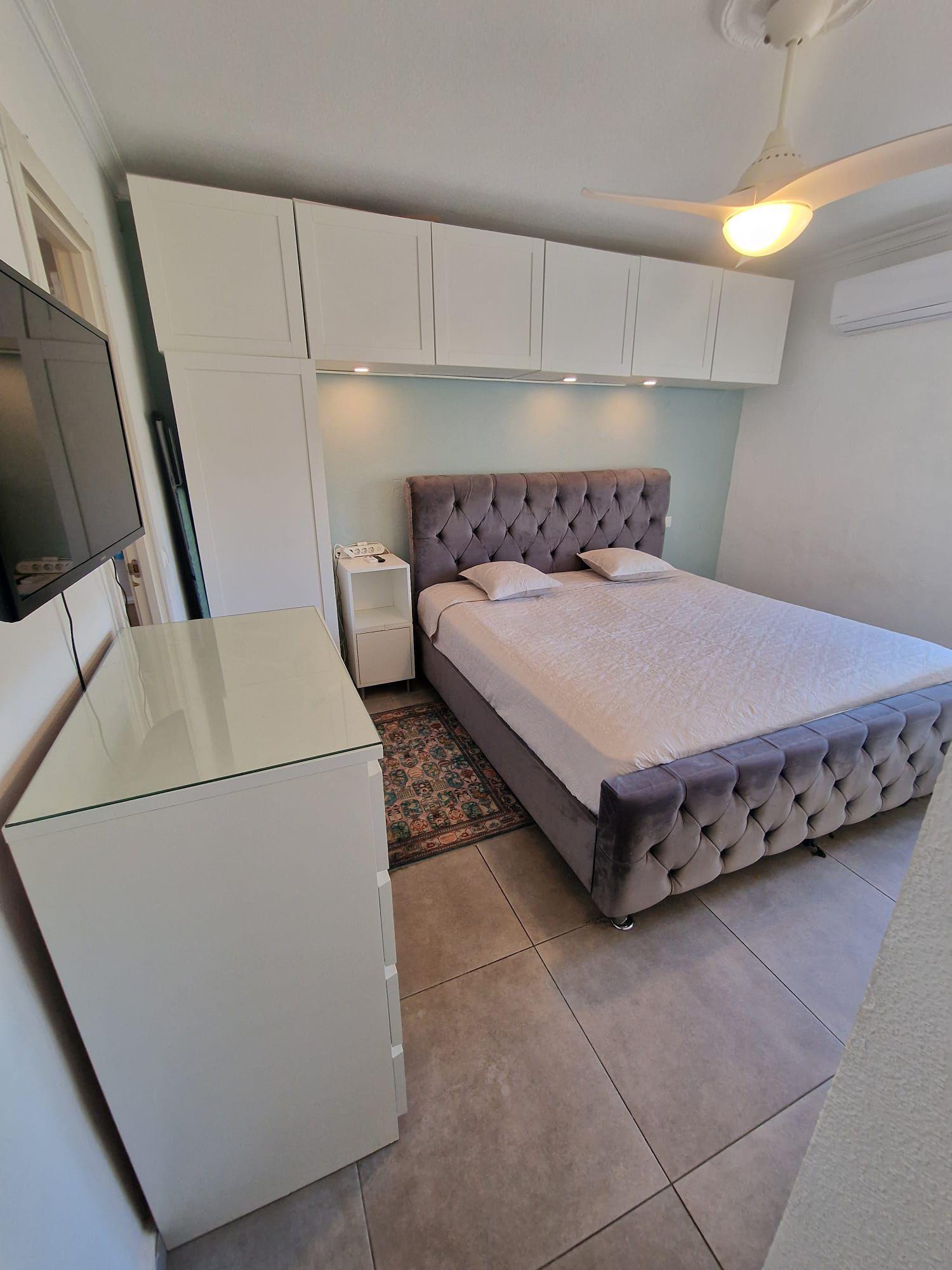 Primera Planta: Dispone de un amplio salón con otro sofá cama, dormitorio principal con cama grande y armarios empotrados, más una cocina que se puede abrir para un diseño más espacioso.