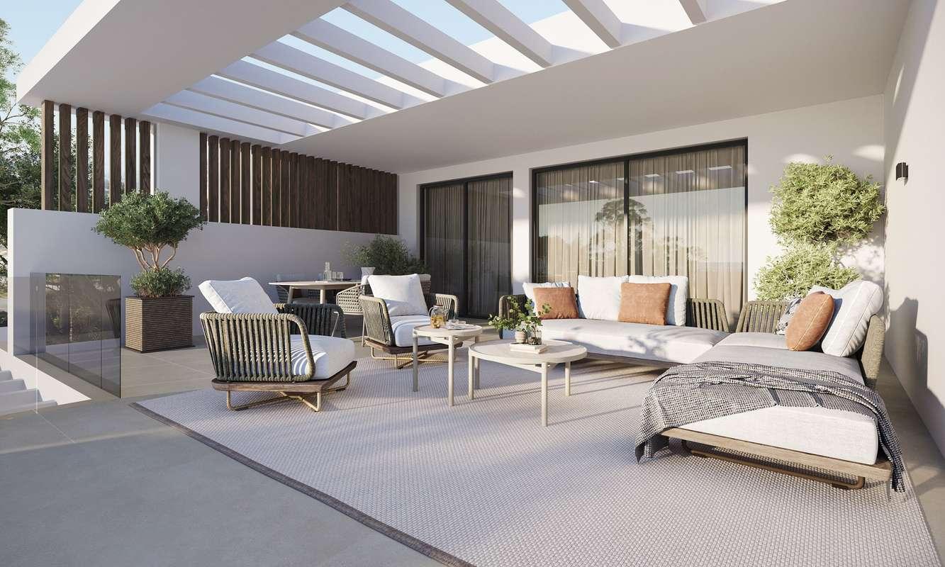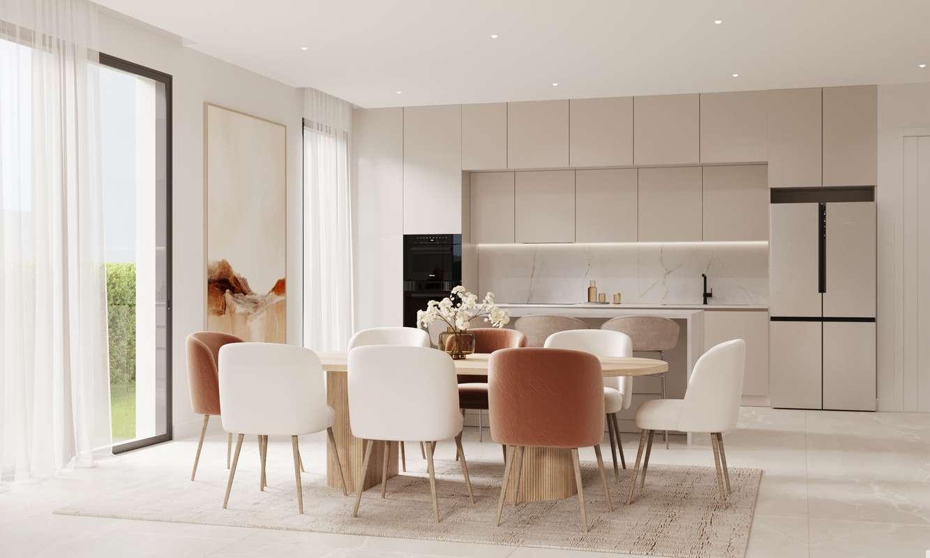 Esta exclusiva comunidad cerrada cuenta con 57 viviendas de 2, 3 y 4 dormitorios. Cada hogar ha sido diseñado con distribución abierta, interiores luminosos y grandes ventanales que conectan con amplias terrazas o jardines privados, creando una perfecta armonía entre el interior y el exterior. Los acabados de alta calidad incluyen elegantes suelos de porcelanato, cocinas modernas y baños con suelo radiante. Cada unidad dispone también de dos plazas de aparcamiento y un trastero, garantizando comodidad y practicidad.