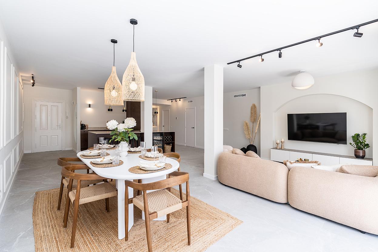 Totalmente reformado y decorado, cuenta con un amplísimo diseño de planta abierta que incluye sala de estar y TV, zona de comedor formal y una cocina con isla totalmente equipada y amueblada con paneles de roble, y todo conectado a la generosa terraza con vistas al golf y su lago hacia la montaña de La Concha y el mar. El luminoso dormitorio principal, con vistas al mar, tiene acceso directo a la terraza y un elegante baño en suite. Dos dormitorios en suite y un aseo de invitados con pequeño lavadero incluido, completan la propiedad.