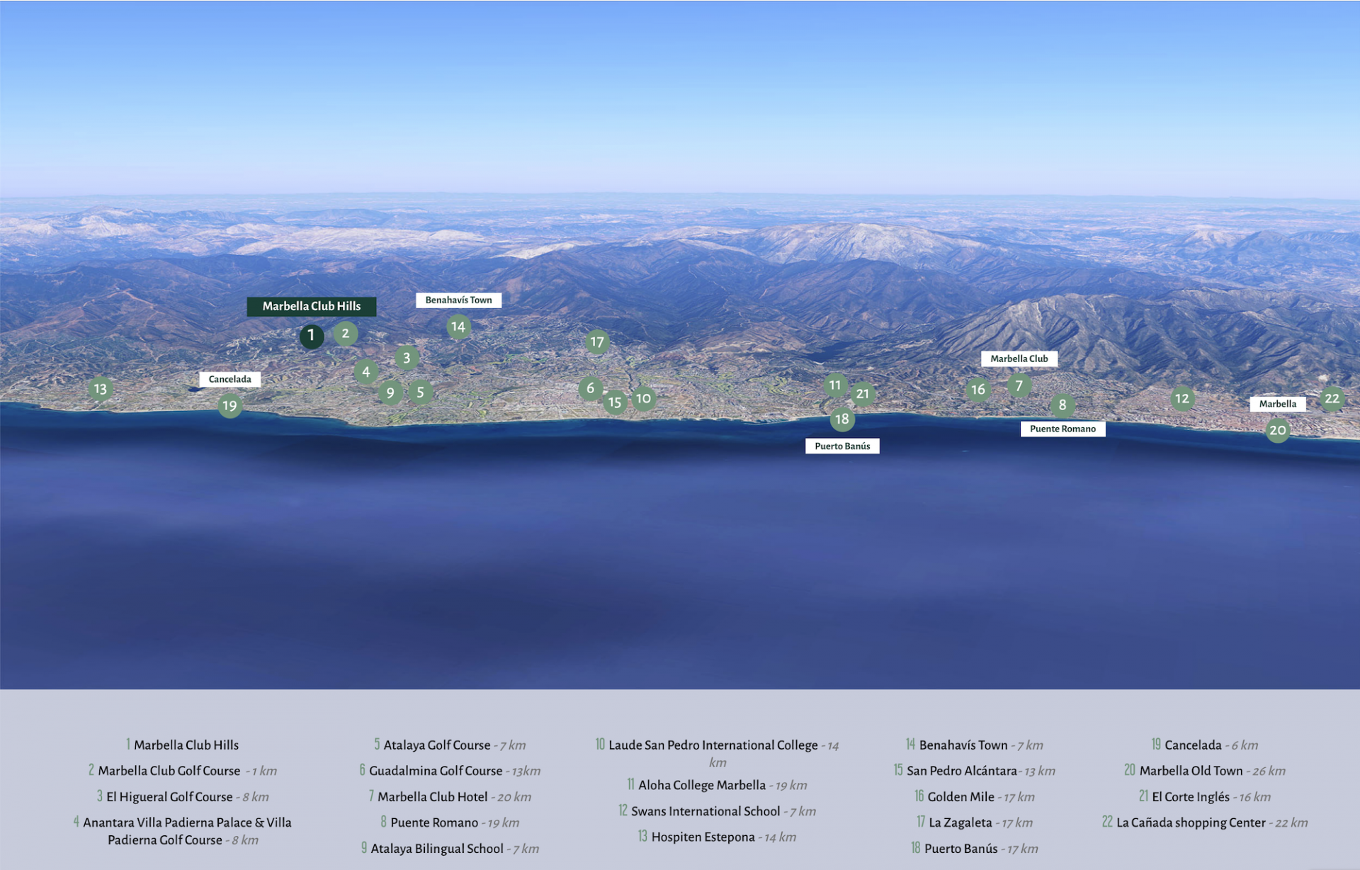Situado en Benahavís, en el exclusivo enclave entre el renombrado Marbella Club Golf Resort y el icónico Anantara Villa Padierna Palace, esta propiedad excepcional se encuentra a solo 20 minutos de Estepona, a 30 minutos del centro de Marbella y a 55 minutos del aeropuerto internacional de Málaga.