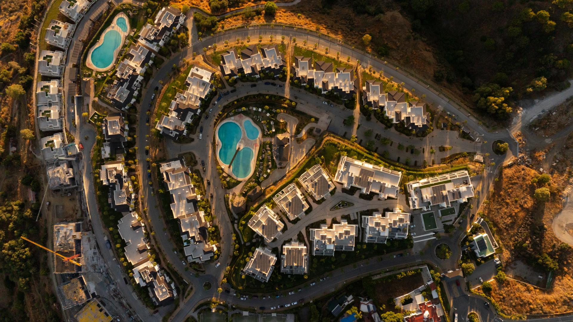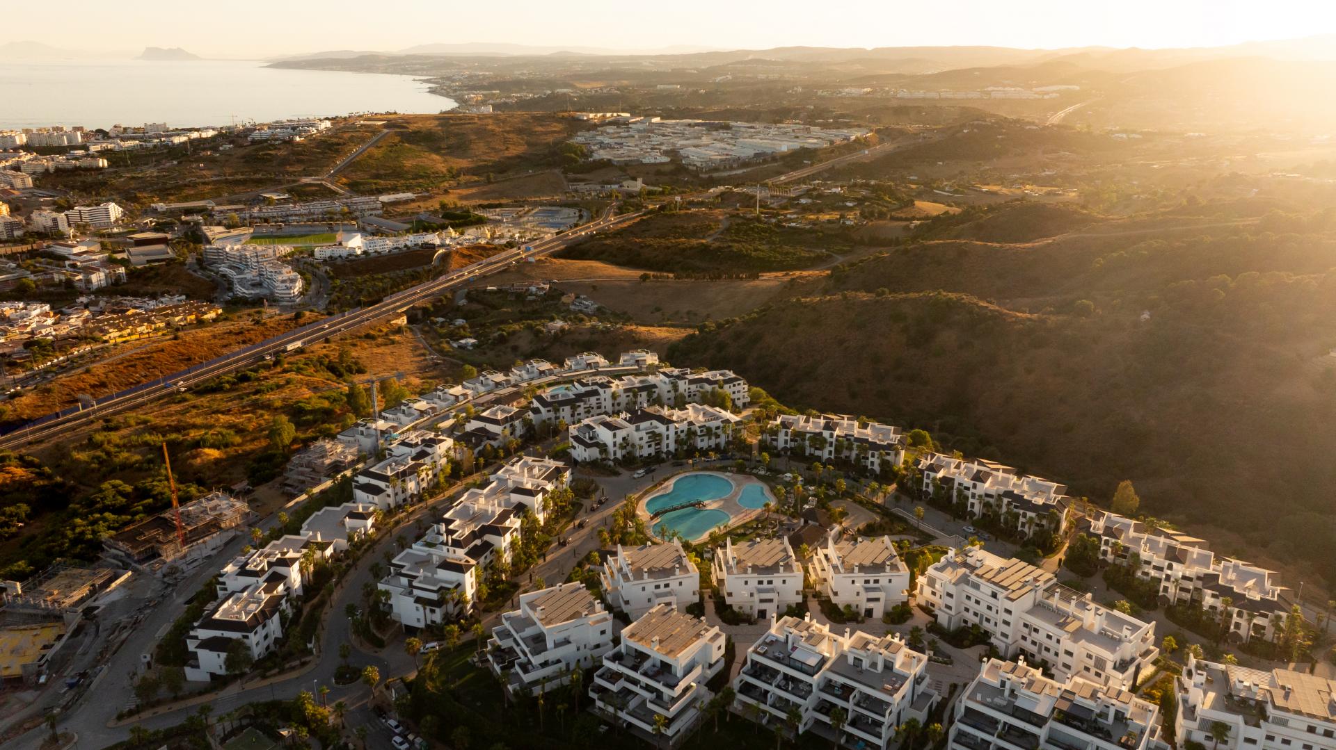 Gracias a su posición elevada, la urbanización ofrece vistas espectaculares y, al mismo tiempo, se encuentra a pocos minutos del casco antiguo de Estepona, sus playas, zonas comerciales y una gran variedad de restaurantes.