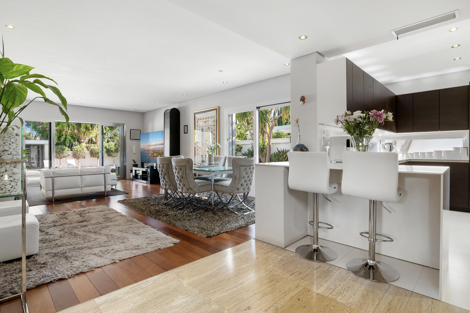 Construida en dos plantas sobre una amplia parcela de 802 m², la propiedad ofrece 249,79 m² construidos más 133 m² de terrazas y porches, creando una conexión fluida entre los espacios interiores y exteriores. El salón-comedor de planta abierta, con techos de doble altura, se comunica directamente con las terrazas, el jardín y la piscina privada, ideal para disfrutar del sol de Marbella o para recibir invitados.