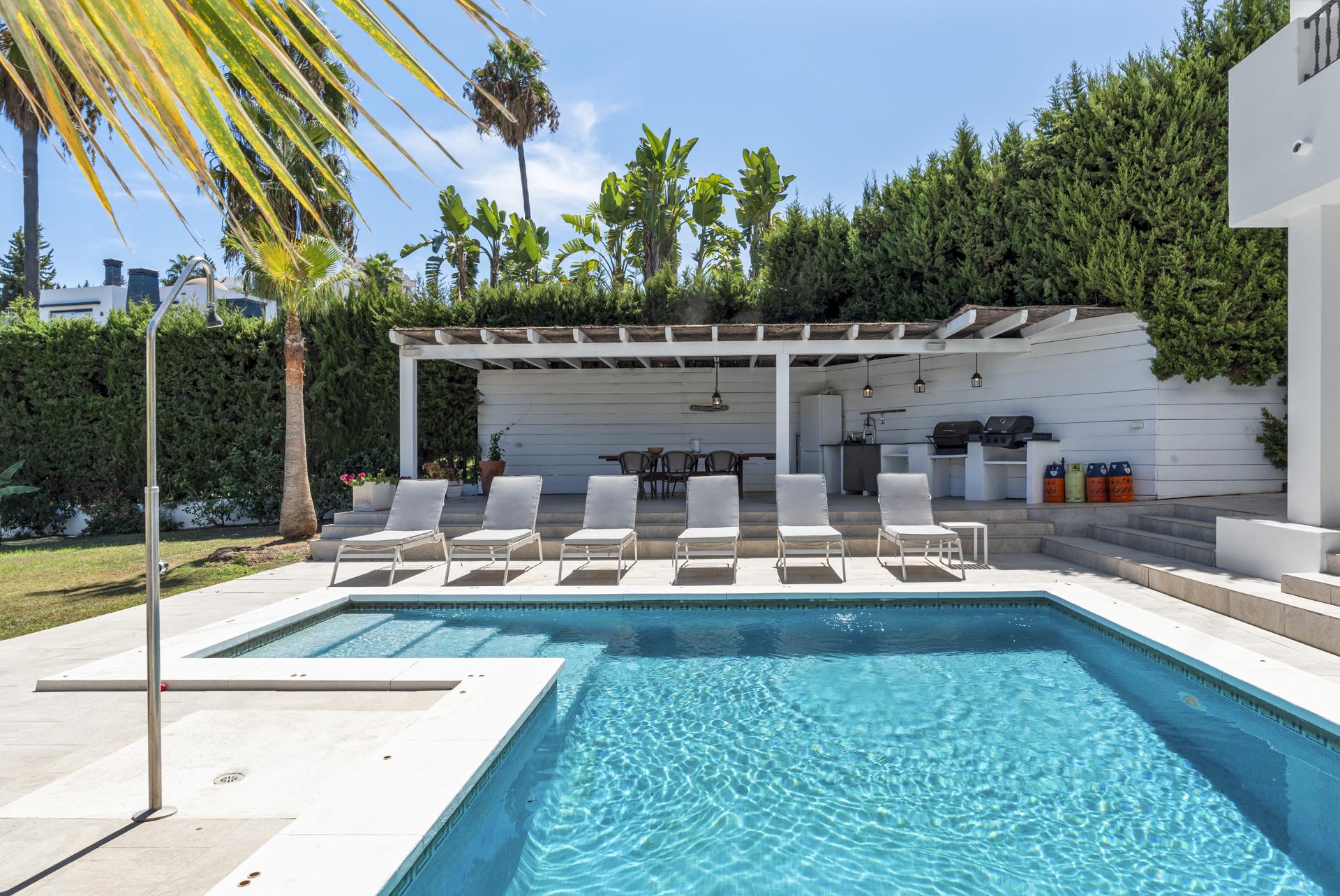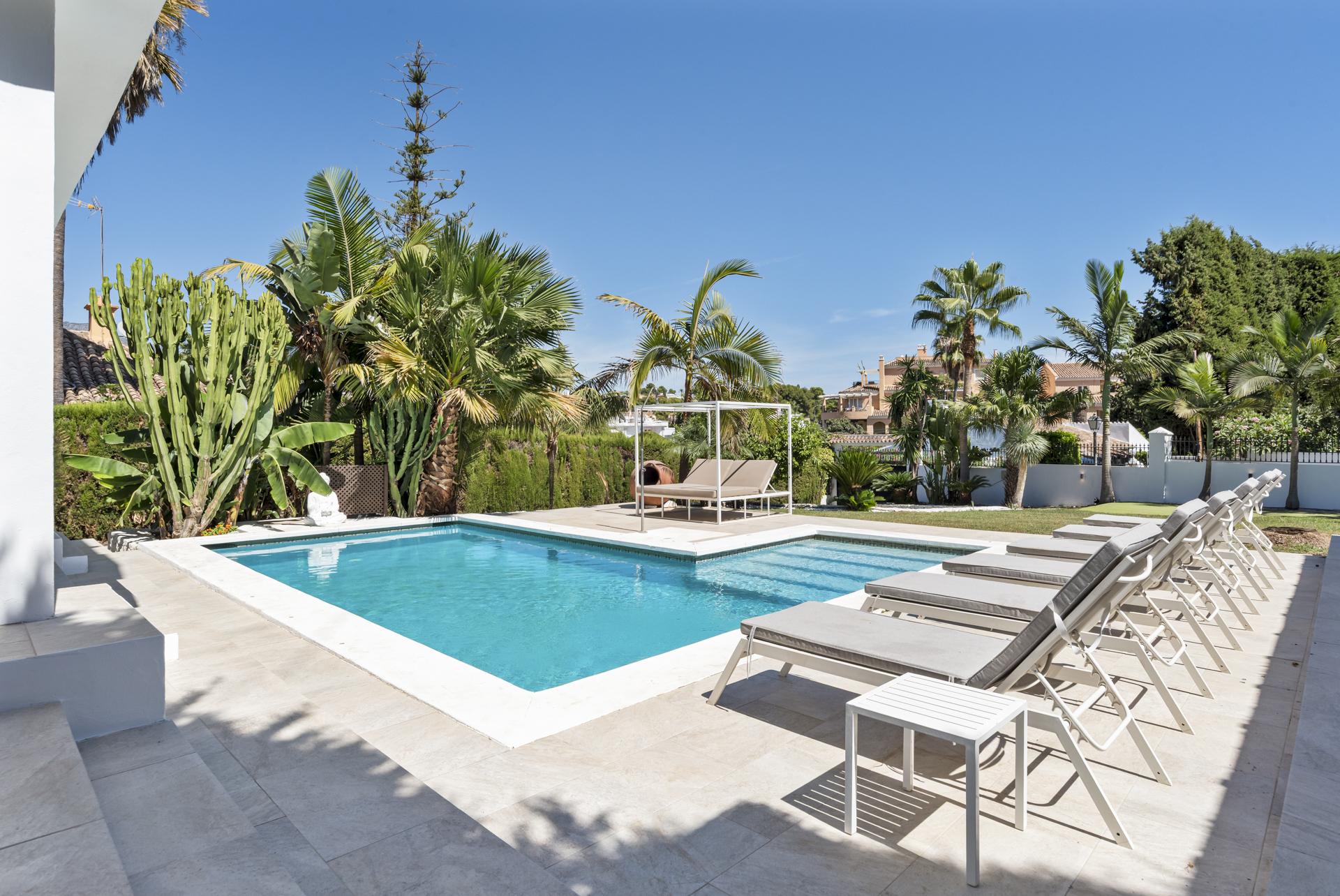 Maison à vendre à Nueva Andalucia, Marbella avec 4 chambres , 3 salles de bain, 1 toilette et a piscine (privé), garage (privé) et jardin (privé). Dimensions: 336m² construit, 1028m² terrain et 76m² terrasse.