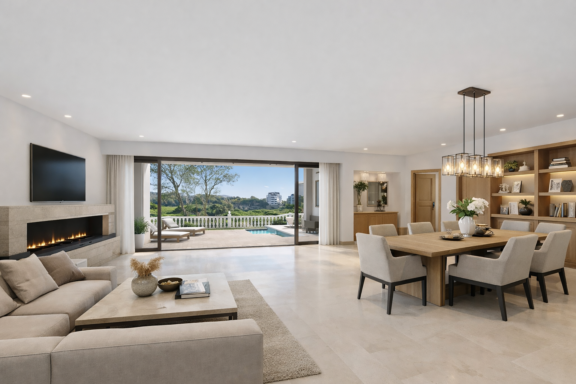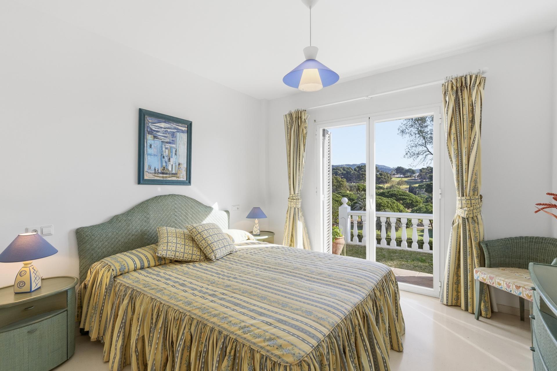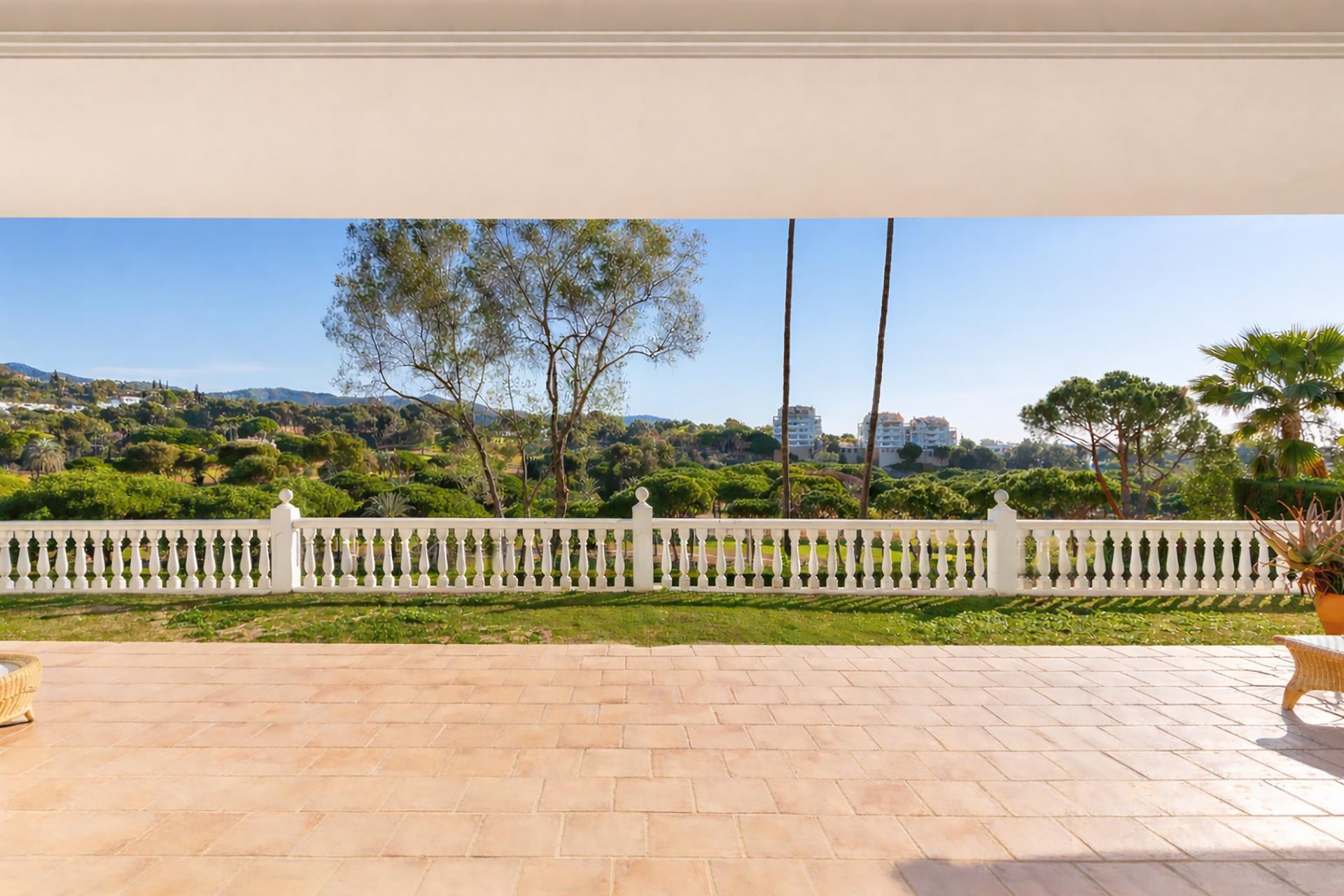 Le spacieux salon-salle à manger avec cheminée dispose de grandes baies vitrées s’ouvrant directement sur une agréable terrasse couverte, avec de belles vues sur le golf et les espaces verts environnants. Cet espace est parfait pour profiter du climat de Marbella tout au long de l’année. La propriété dispose également d’une cuisine indépendante avec coin repas.