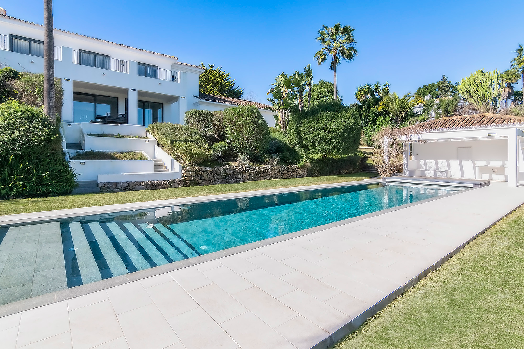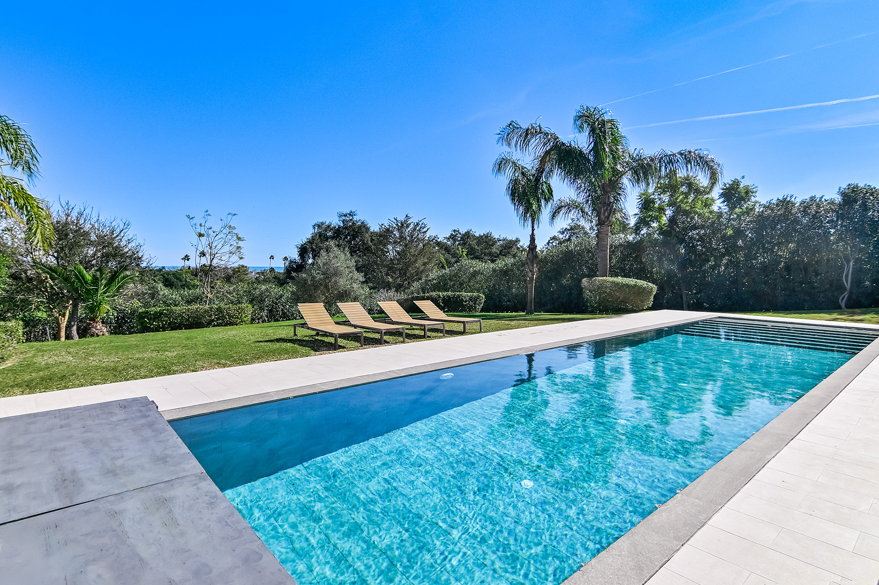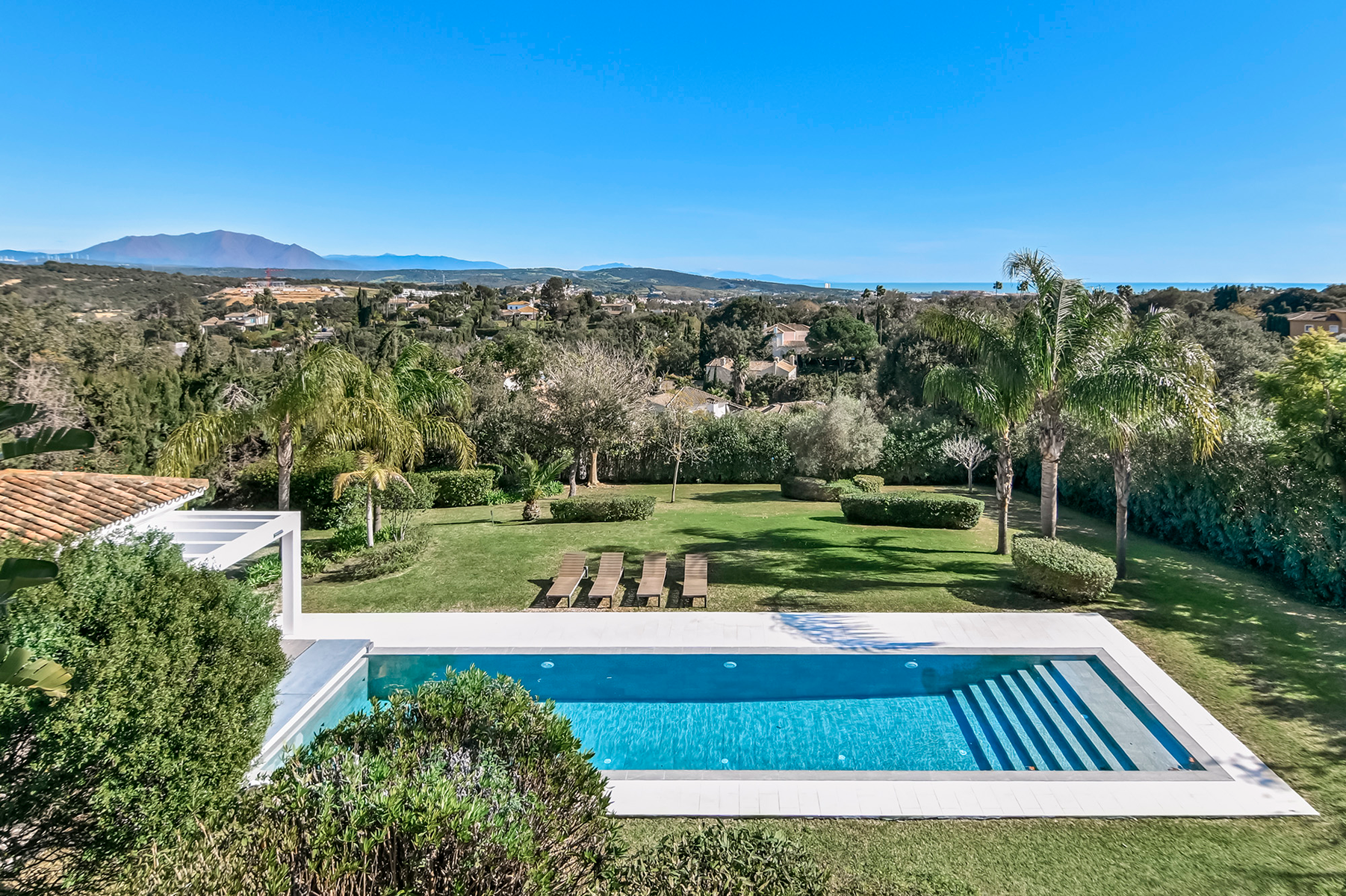 Villa contemporaine à louer avec vue dégagée sur la vallée de Sotogrande et la mer. Située sur l'Avenida de Los Cortijos, à Sotogrande Alto, la propriété repose sur un terrain en terrasse de 2 983 m² et offre environ 500 m² de surface habitable. Construite à l'origine en 1986, elle a été entièrement rénovée en 2023.
