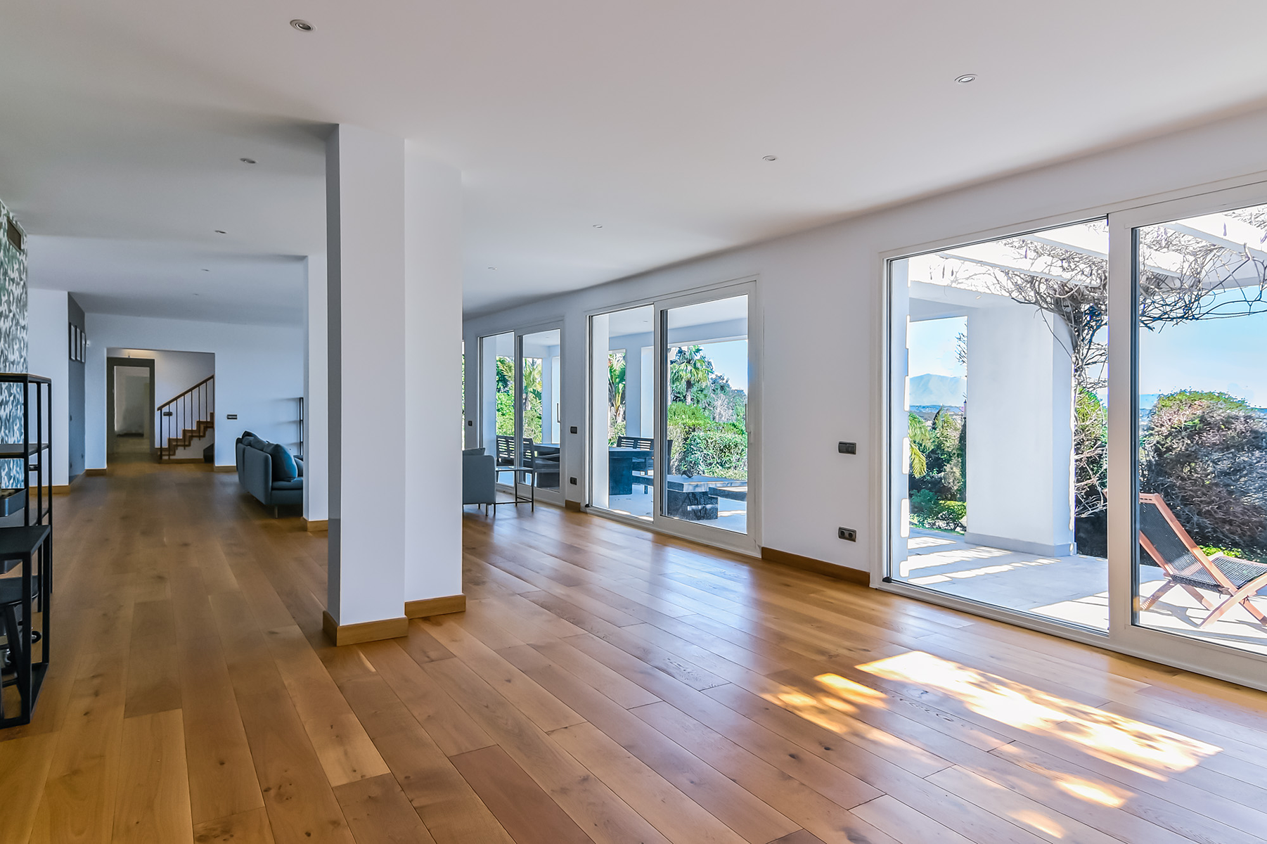 Au premier étage se trouvent quatre chambres partageant deux salles de bains complètes, offrant une disposition confortable pour la vie de famille. Le dernier étage est réservé à la chambre principale, avec salle de bains attenante, dressing et vue panoramique depuis une grande terrasse donnant sur la Méditerranée.