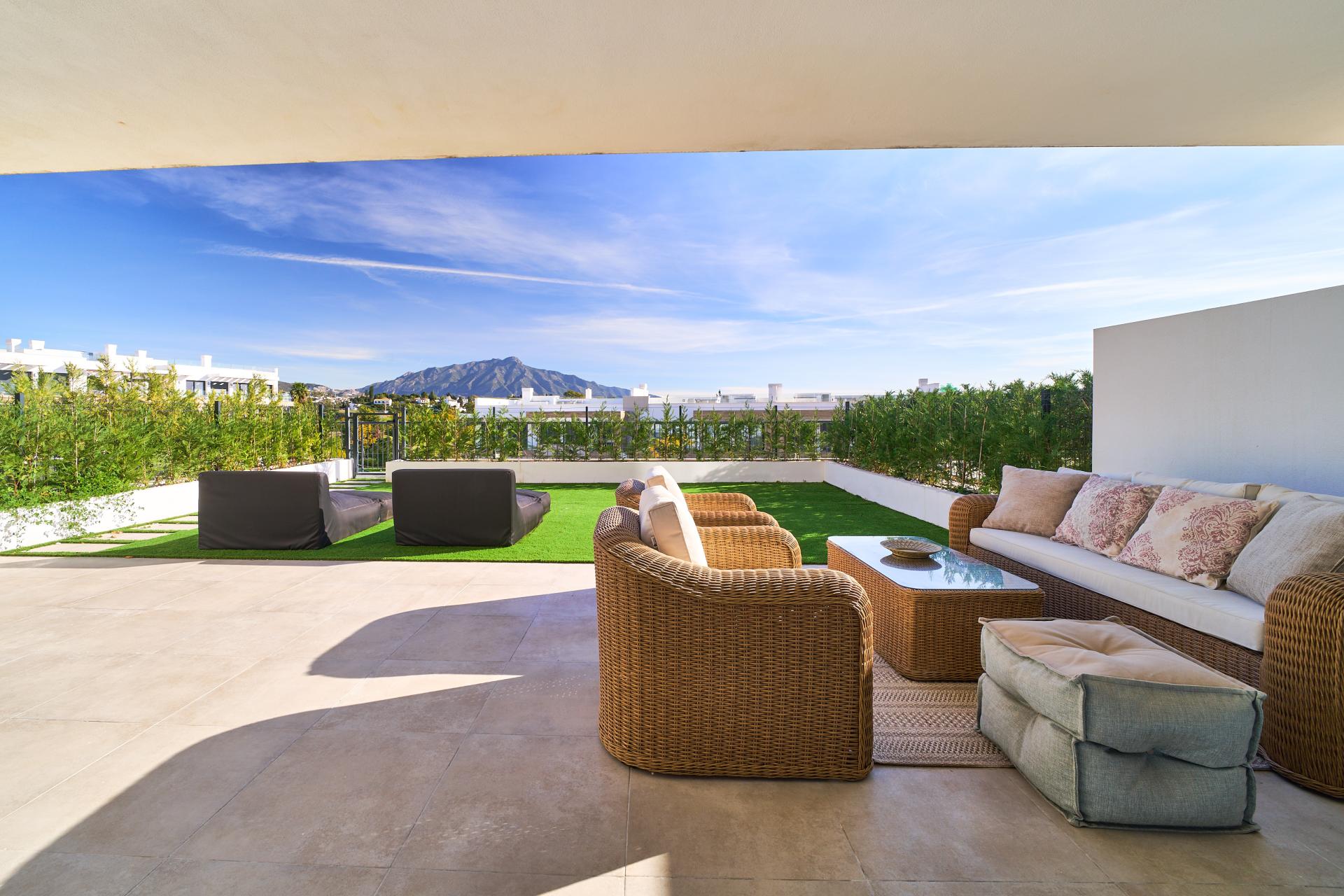 Appartement begane grond te koop in Atalaya Golf, Estepona Oost met 2 slaapkamers, 2 badkamers, 1 en-suite bathroom, ingebouwd 2024 en heeft zwembad (gemeenschappelijk), garage (privé) en tuin (privé). Afmetingen: 132m² bebouwd, 92m² interieur en 125m² terras.