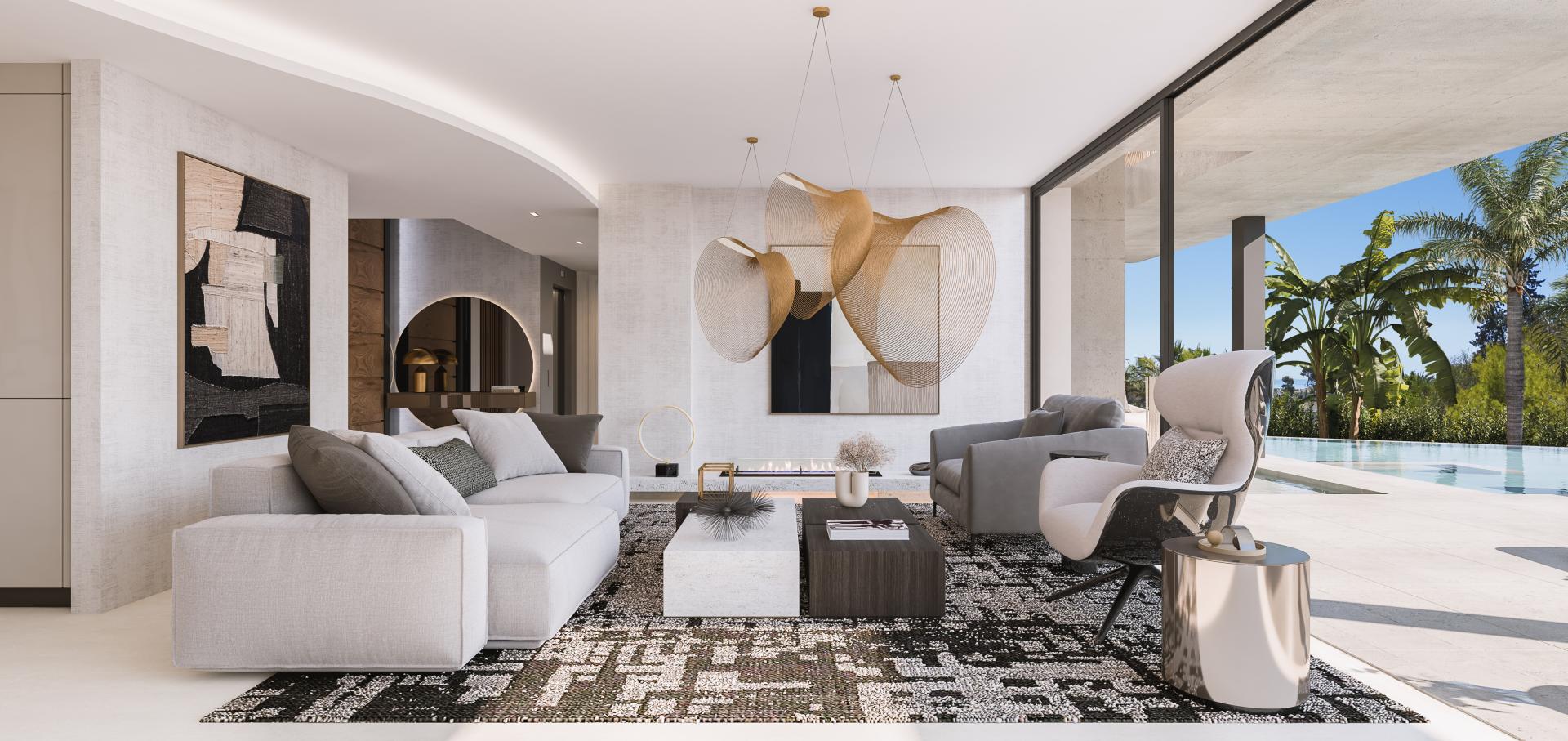 Villa te koop in Lomas del Virrey, Marbella Golden Mile met 5 slaapkamers, 5 badkamers, 5 en-suite badkamers, 2 toiletten, ingebouwd 2026 en heeft zwembad (privé), garage (privé) en tuin (privé). Afmetingen: 1215.86m² bebouwd, 1197.56m² perceel, 613.47m² interieur en 461.64m² terras.